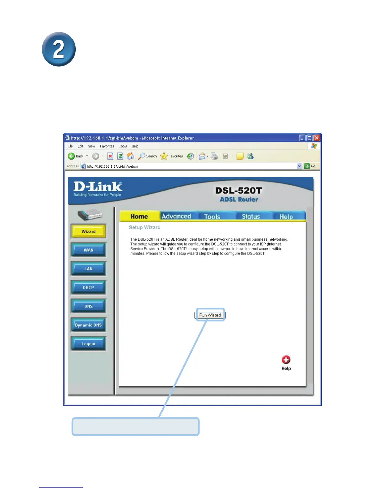 инициализации работы мастера установки нажмите кнопку Run Wizard в середине Web-