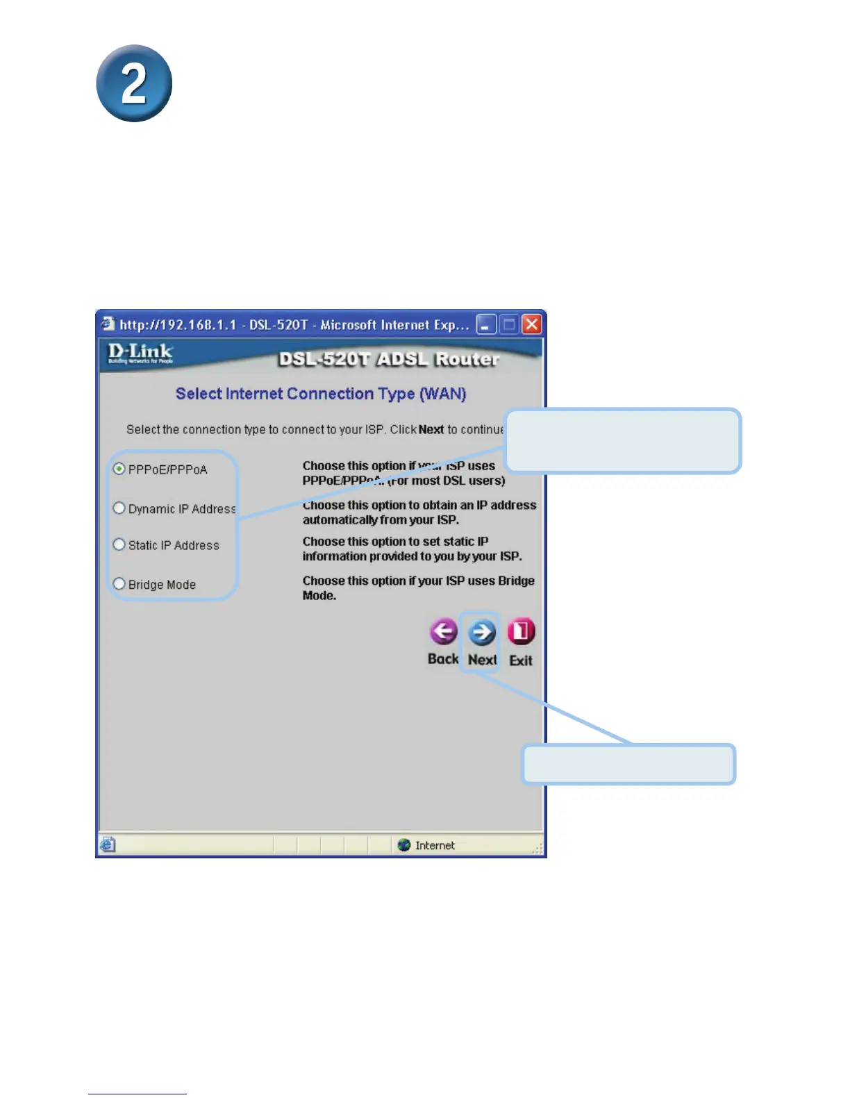the Next button depends on what connection type you select. The connection types available in
