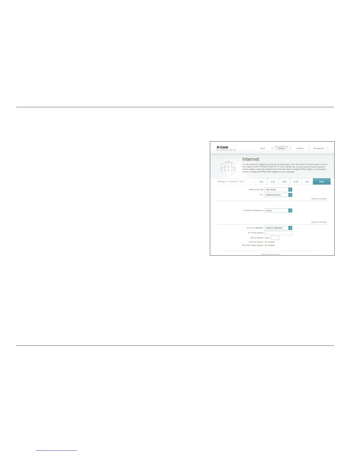 Choose DS-Lite if your ISP uses a Dual Stack Lite connection. Your ISP will provide you with the required information. Thisoption is typically used for