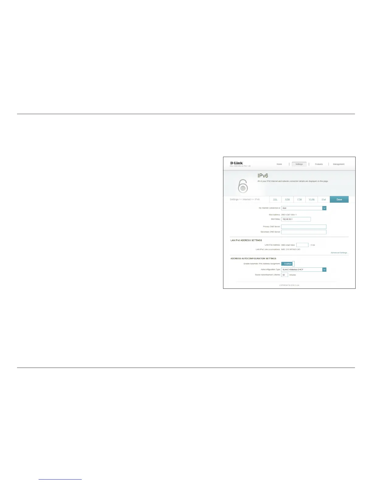 In this section the user can congure the IPv6 6 to 4 connection settings. 6to4 is an IPv6 address assignment and automatic tunneling
