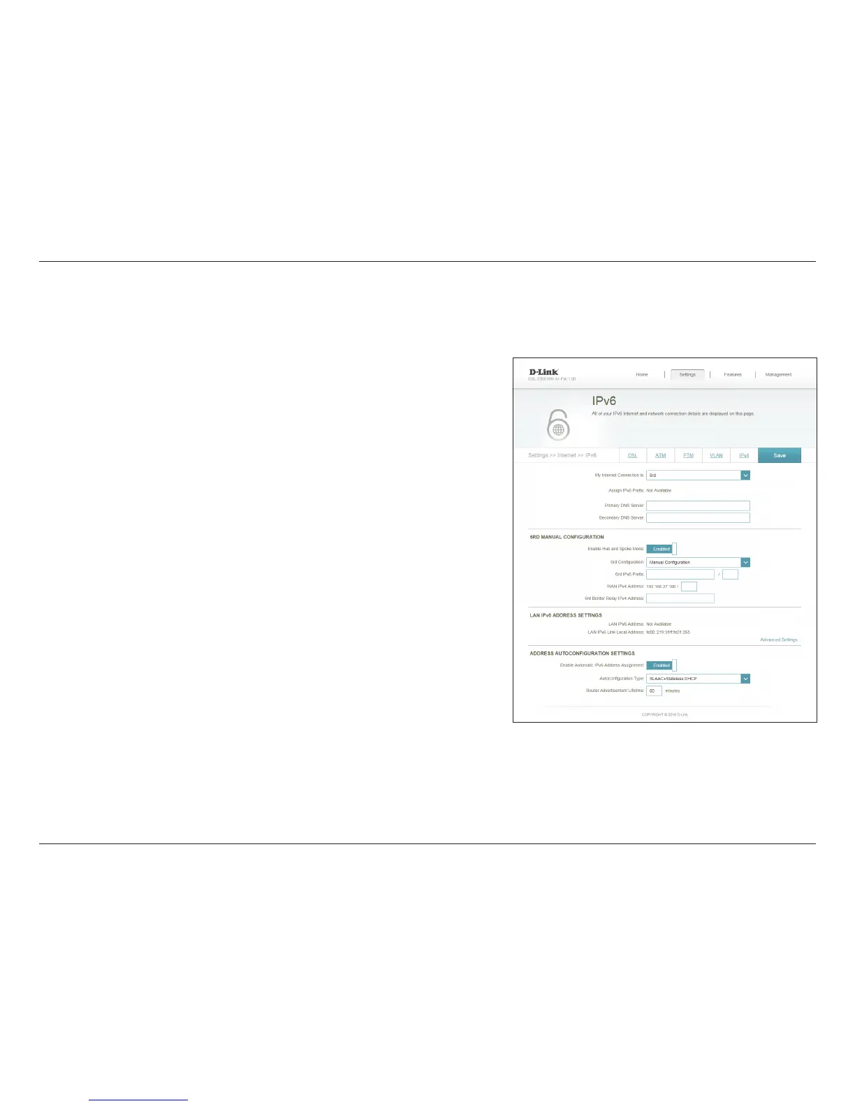 In this section the user can congure the IPv6 6rd connection settings.