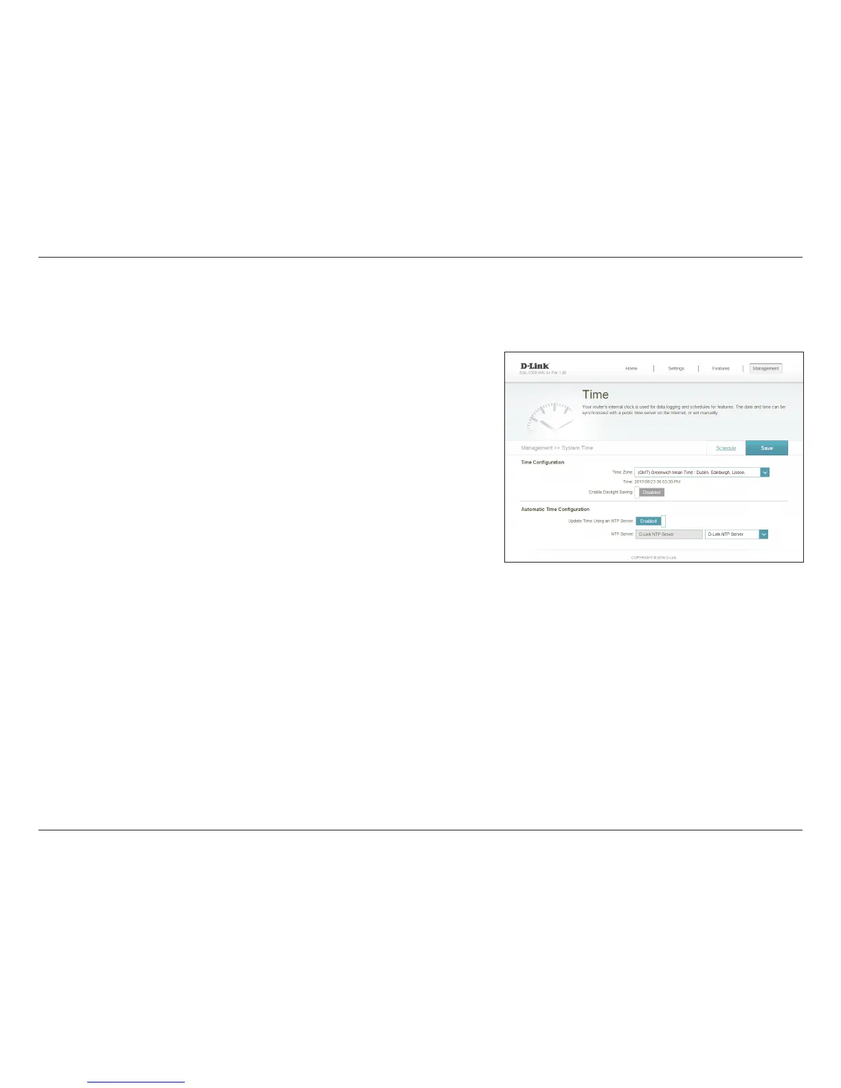 Protocol (NTP) server, and enable or disable daylight saving time.