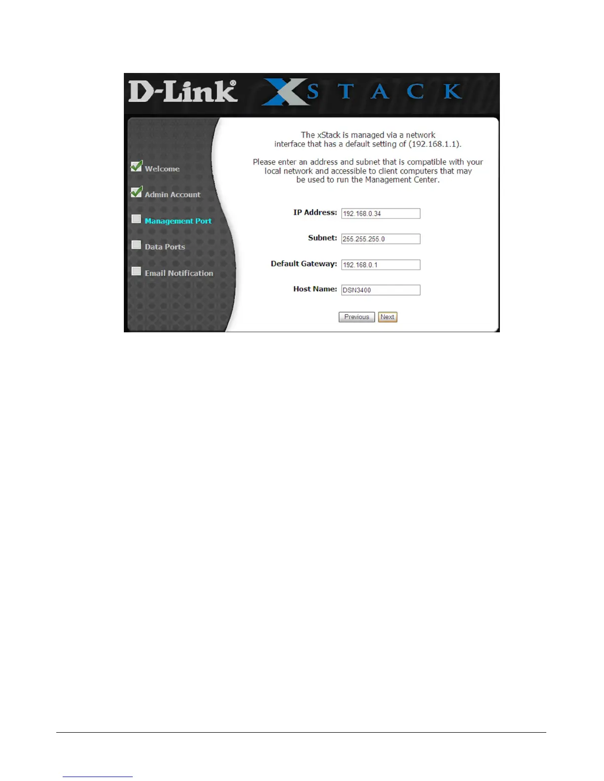 gateway, and host name of the xStack Storage management port. The settings you specify