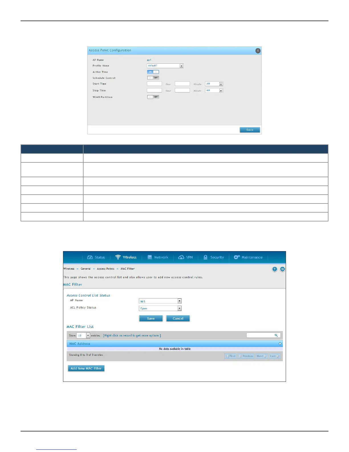 5. The MAC Filter page displays the elds mentioned in the table below.