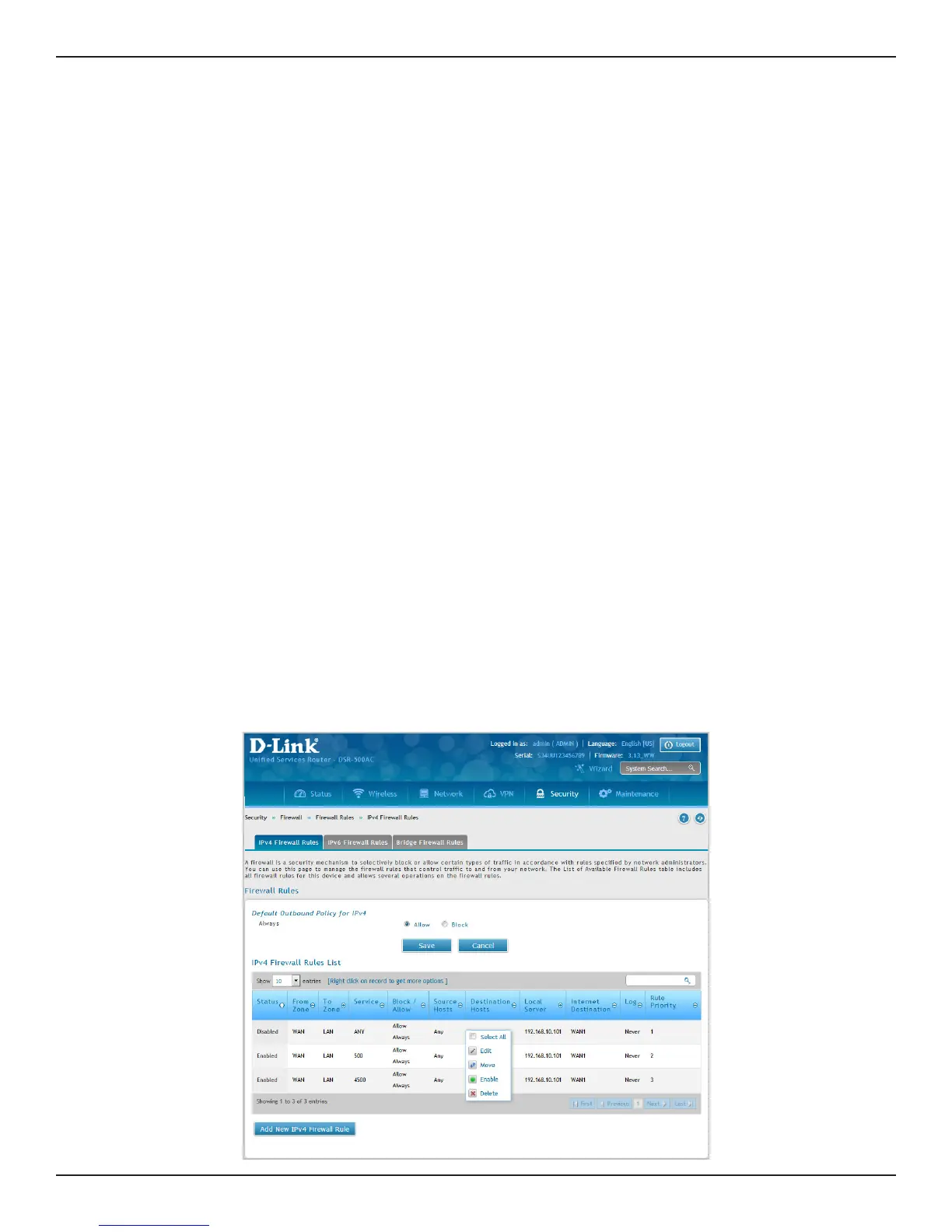 Path: Security > Firewall > Firewall Rules > IPv4 Firewall Rules or IPv6 Firewall Rules