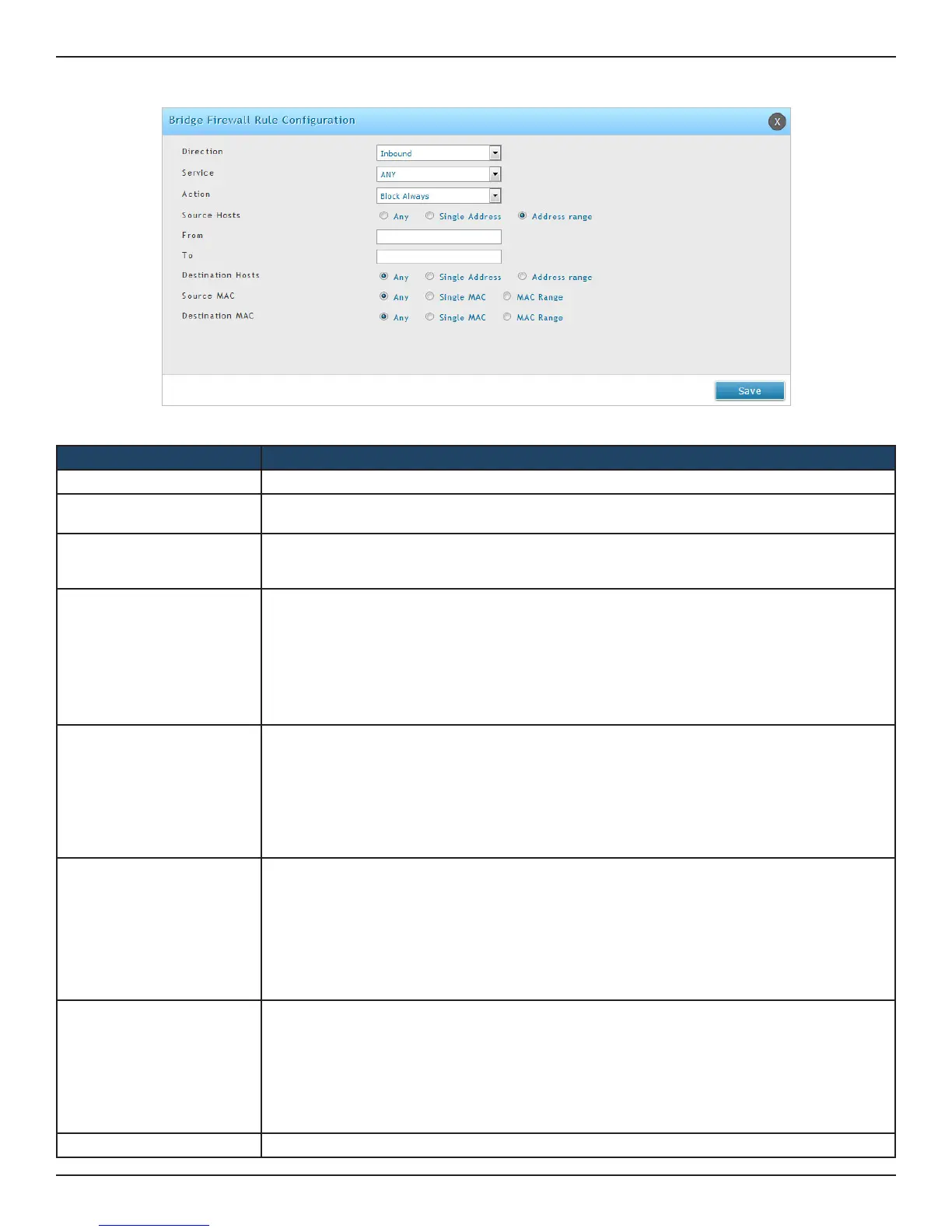 • Any: Choose this option for a rule that applies to trac destined for all MAC Addresses of the