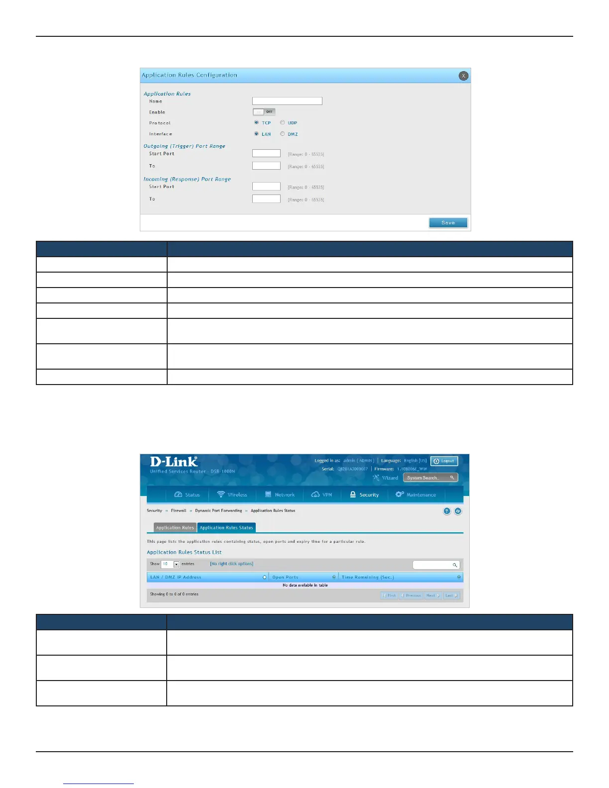 4. Click Security > Firewall > Dynamic Port Forwarding > Application Rules Status tab to see a list of
