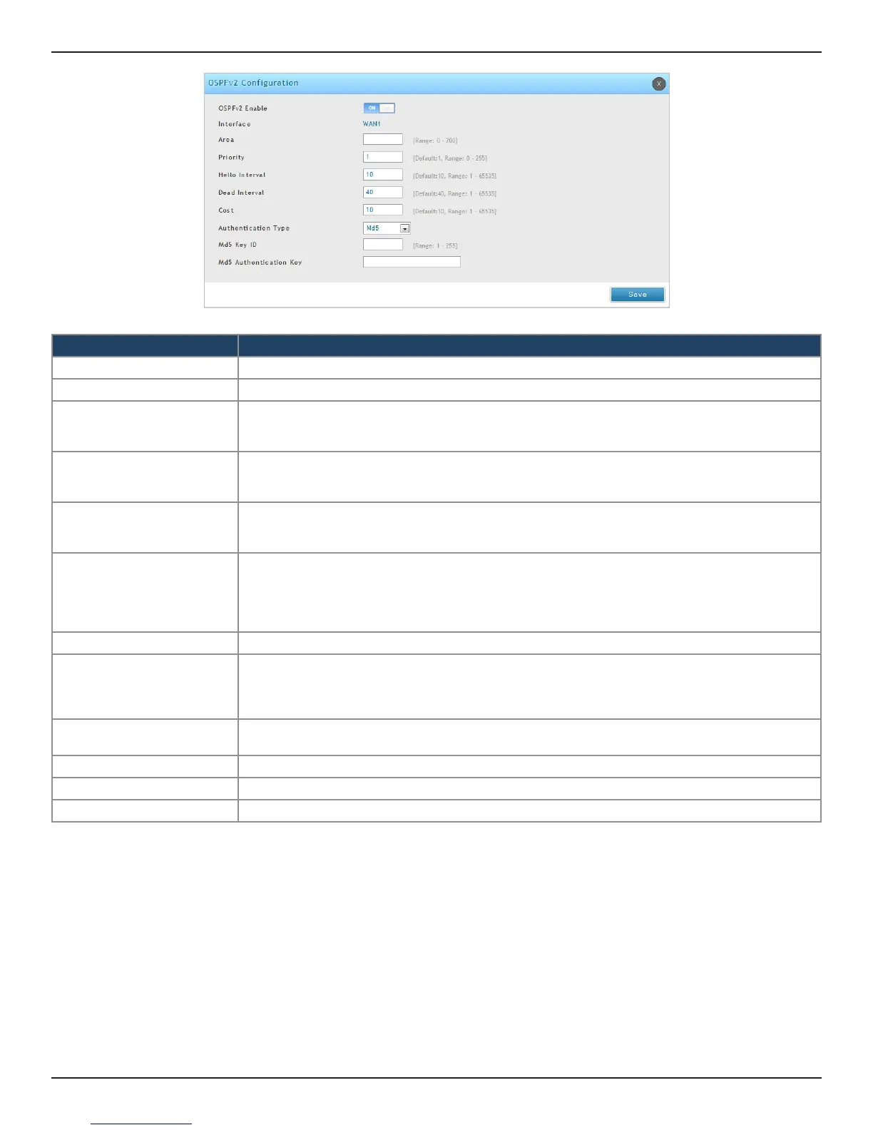 • MD5: The interface authenticates OSPF packets with MD5 authentication.
