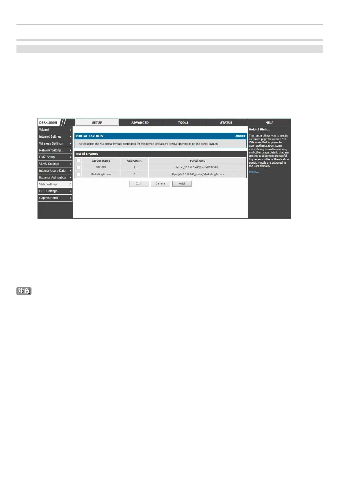 1. SETUP > VPN Settings > SSL VPN Server > Portal Layouts の順にメニューをクリックし、以下の画面を表示します。