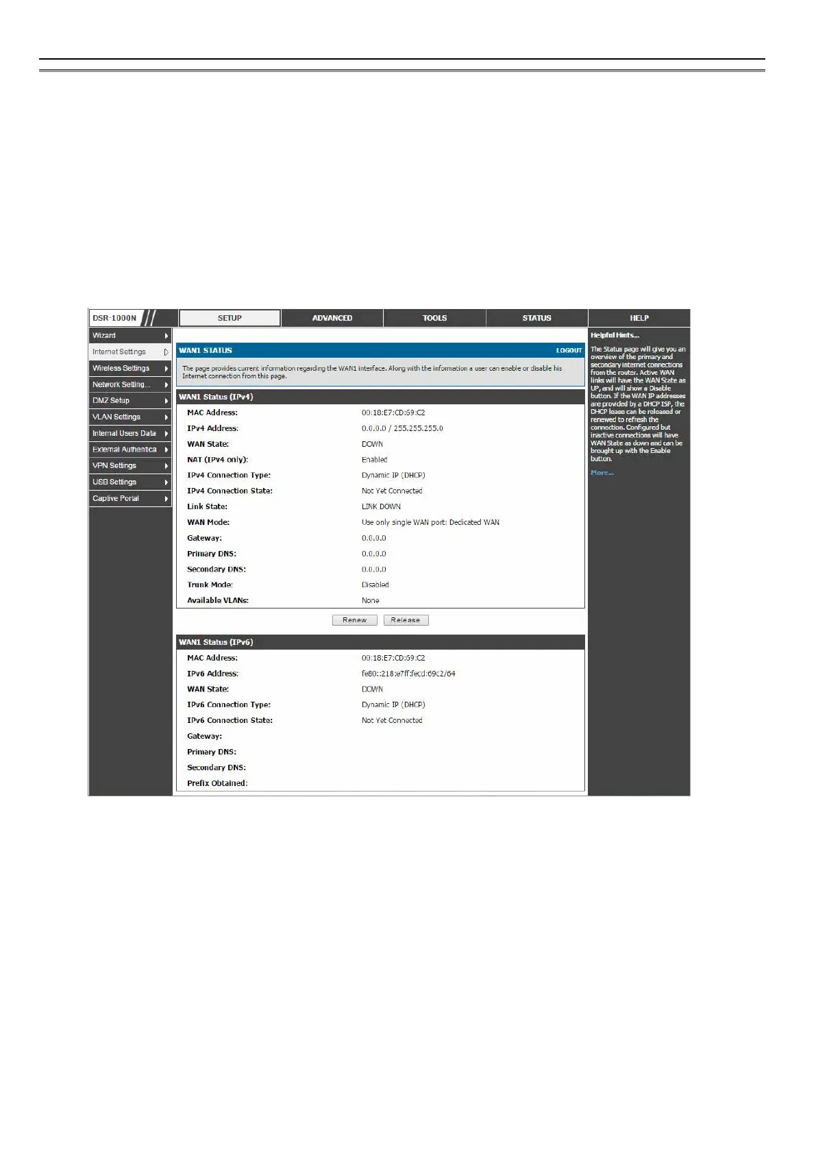 1. SETUP > Internet Settings > WAN1 Settings > WAN1 Status の順にメニューをクリックし、以下の画面を表示します。
