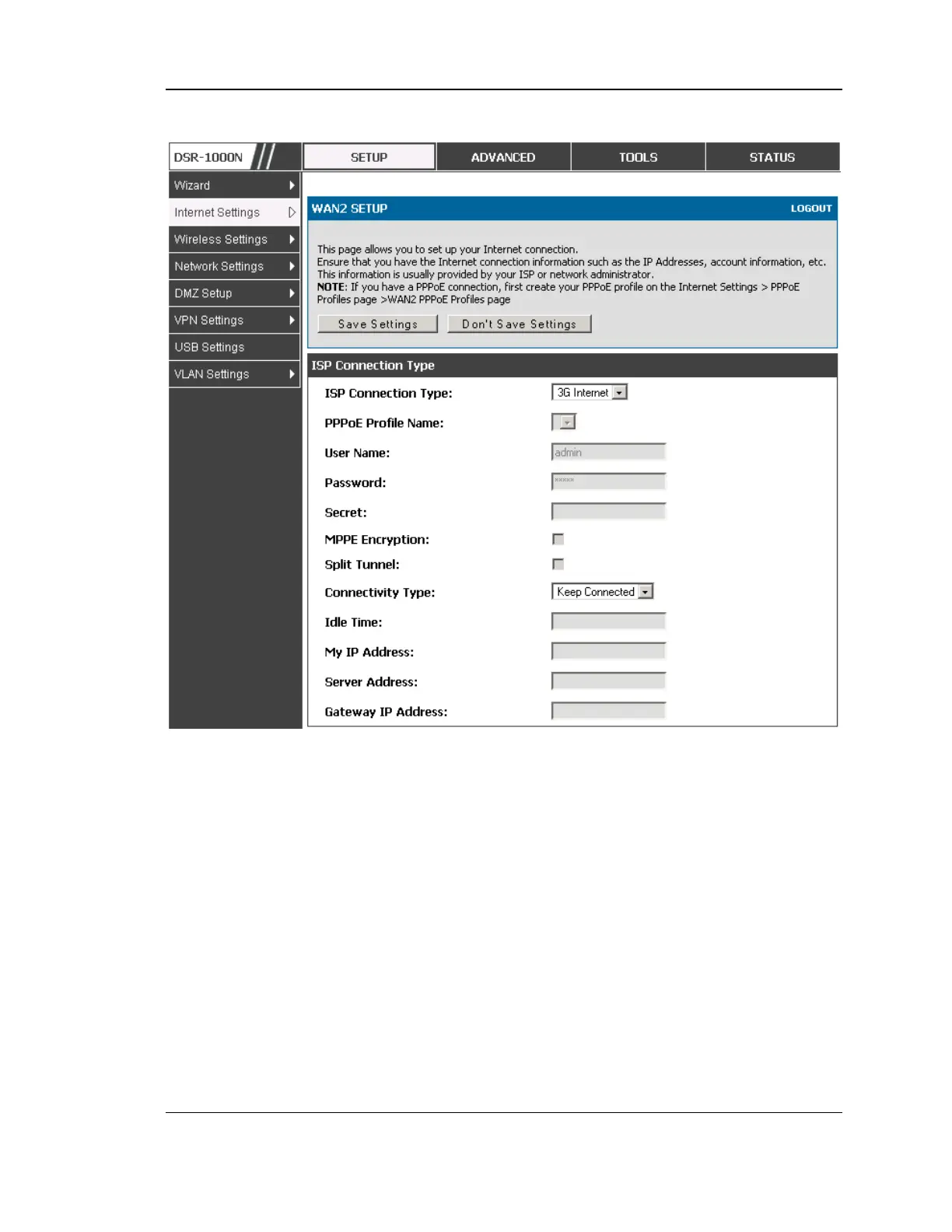 Cellular 3G internet access is available on WAN2 via a 3G USB modem for DSR-