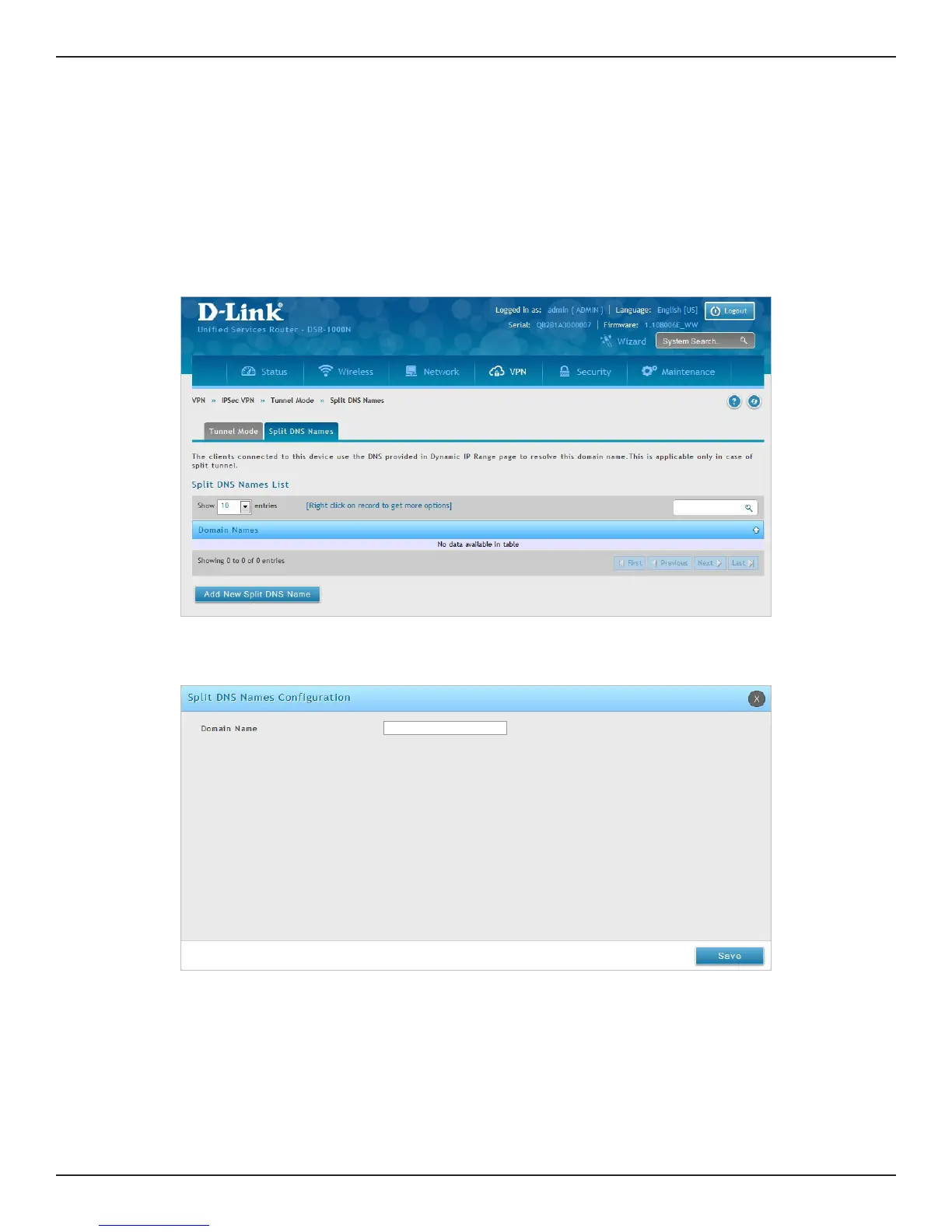 1. Click VPN > IPSec VPN > Tunnel Mode > Split DNS Names tab.