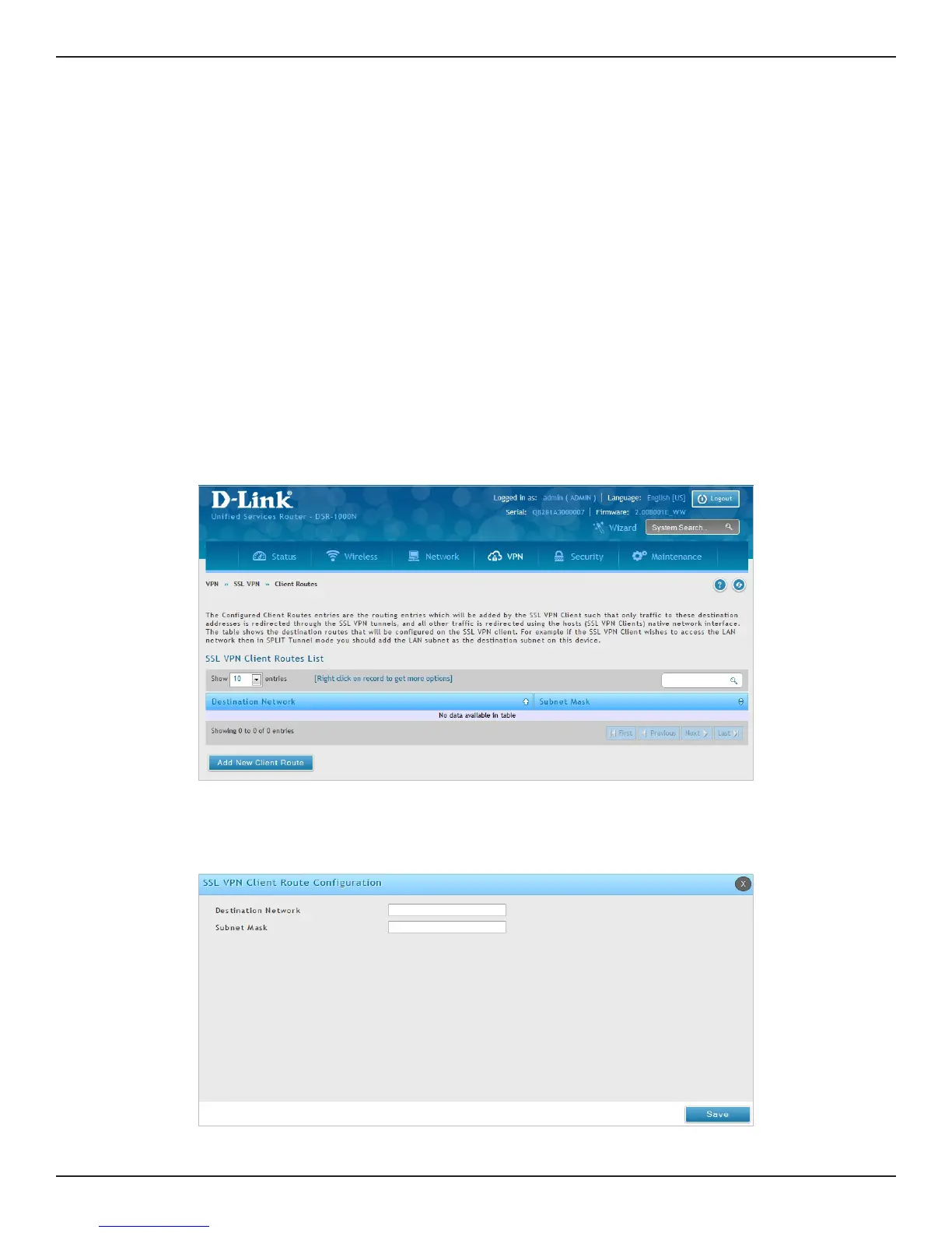 When split tunnel mode is enabled, the user is required to congure routes for VPN tunnel clients: