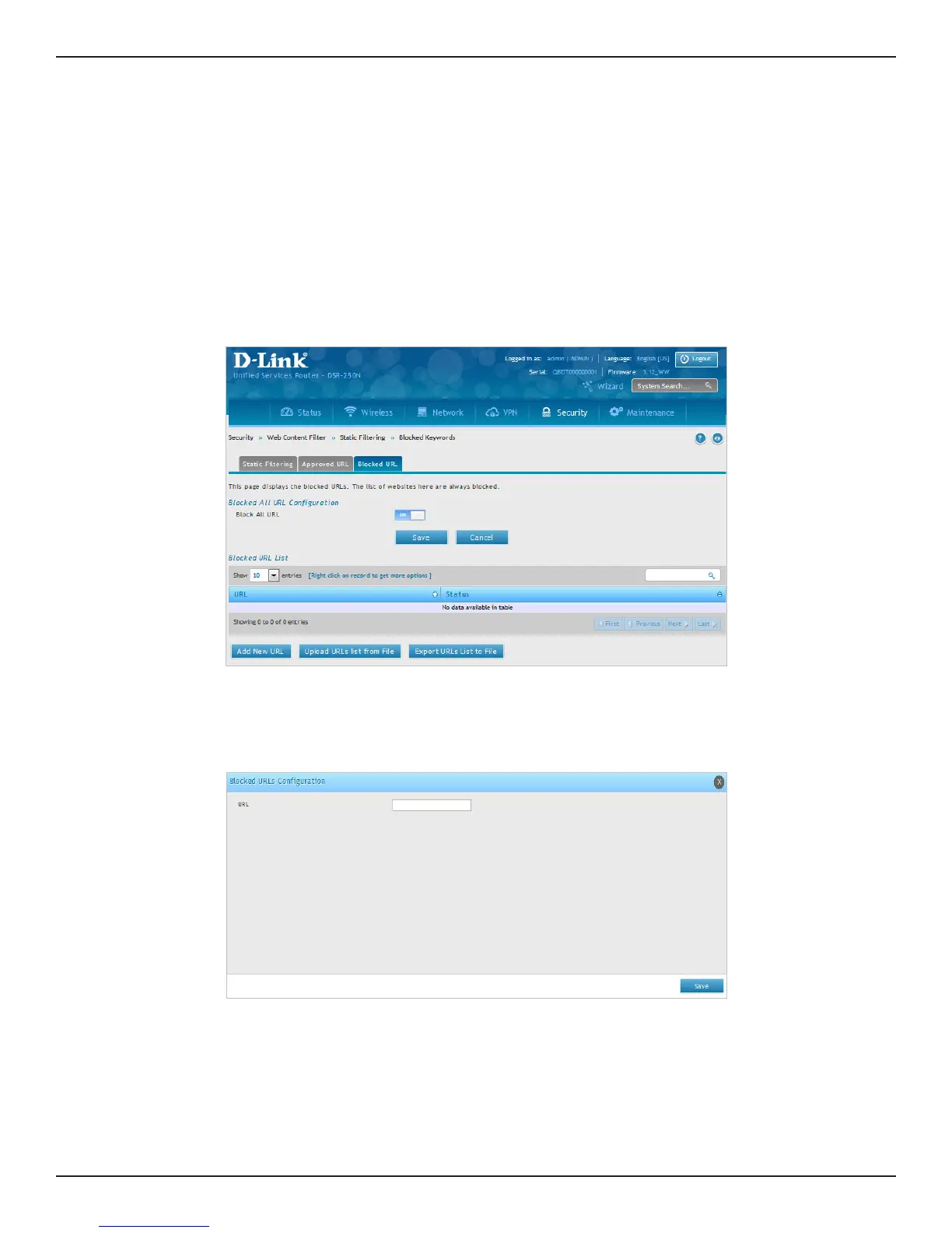 1. Click Security > Web Content Filter > Static Filtering > Blocked URL tab.