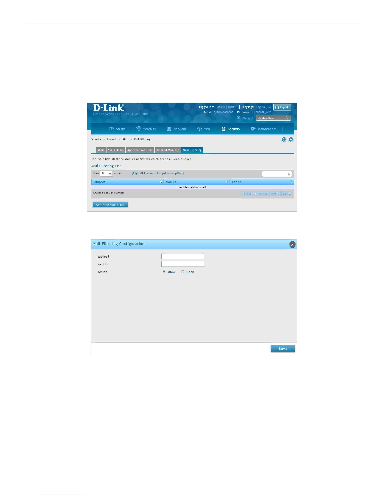 1. Click Security > Firewall > ALGs > Mail Filtering tab.