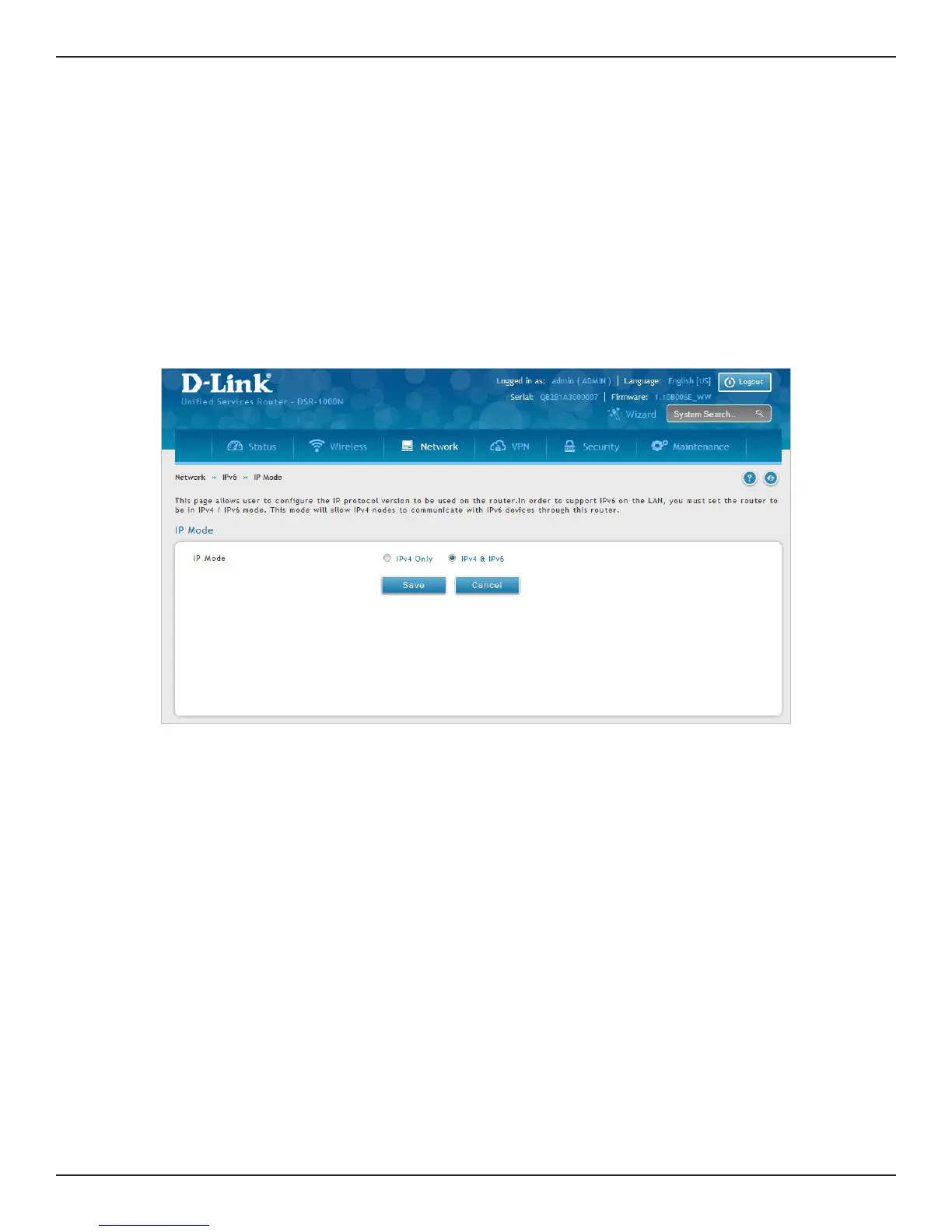 This page allows you to congure the IP protocol version to be used on the router. In order to support IPv6 on
