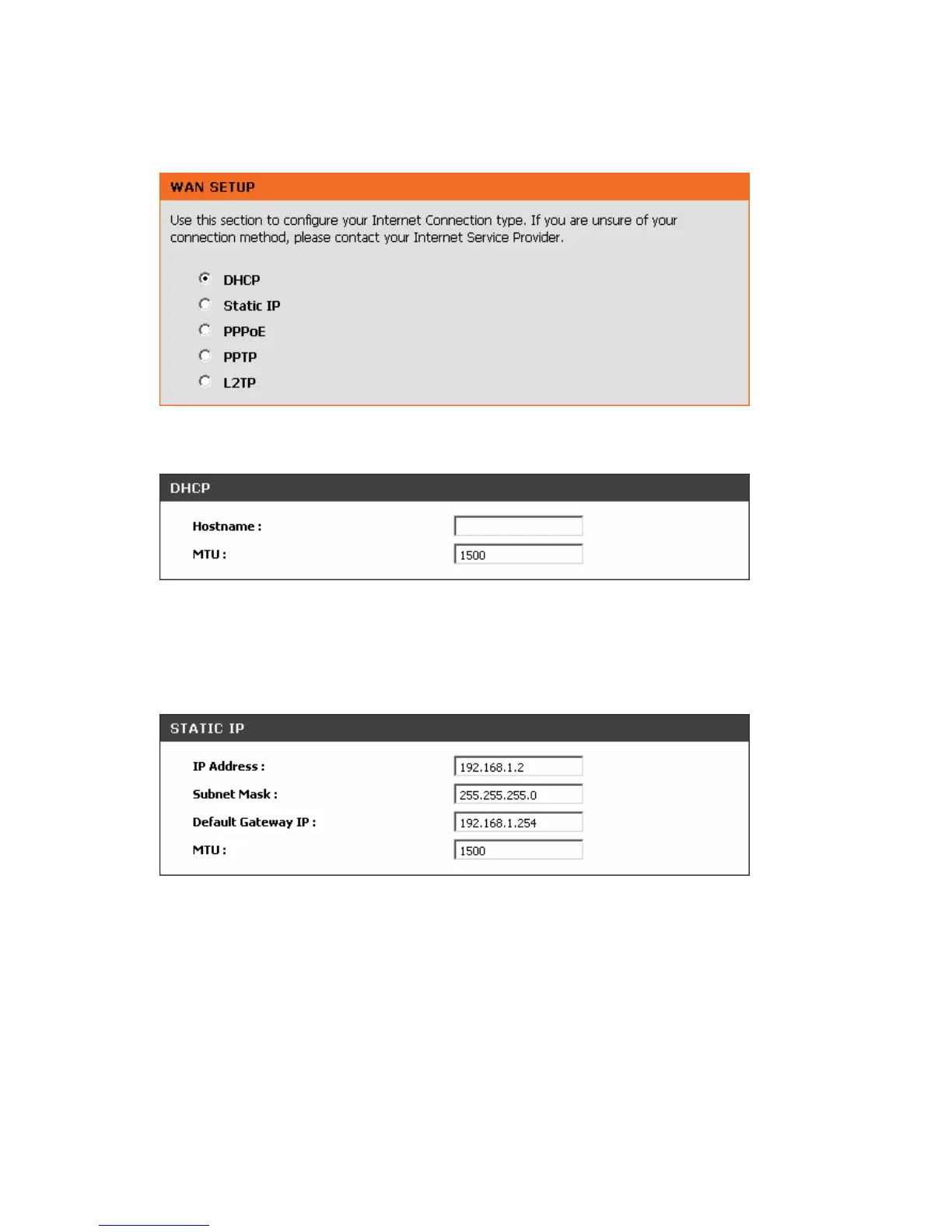 DHCP: Select this option if your ISP (Internet Service Provider) provides you an IP address automatically.