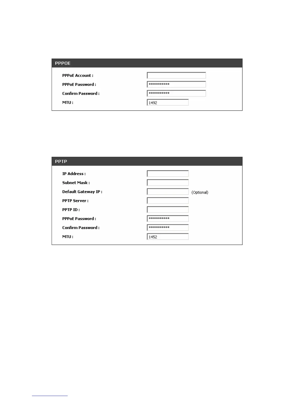 connection. Enter the PPPoE Account, PPPoE Password and re-enter Password to confirm.
