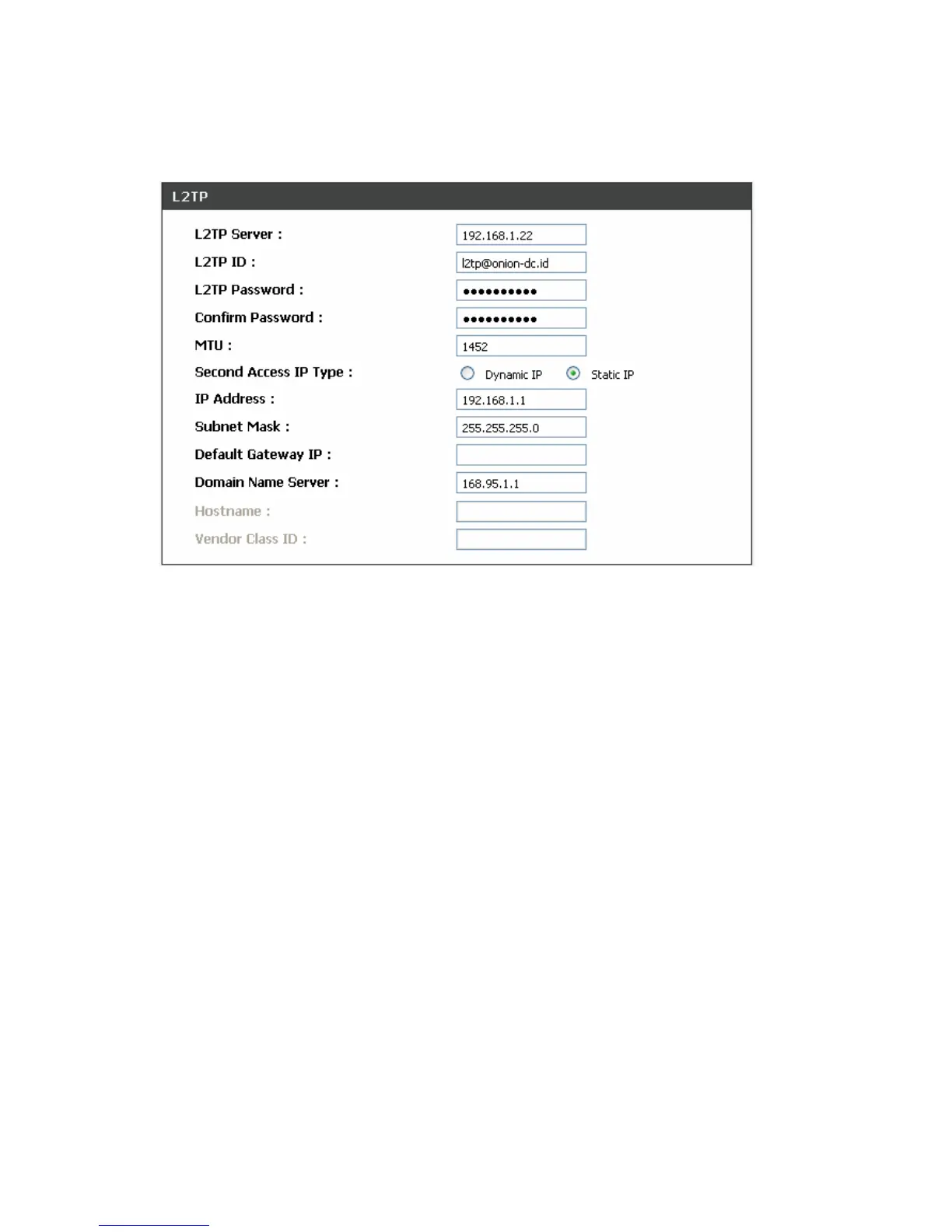 L2TP: Layer 2 Tunneling Protocol is a WAN connection. Enter the IP Address, Subnet mask, L2TP