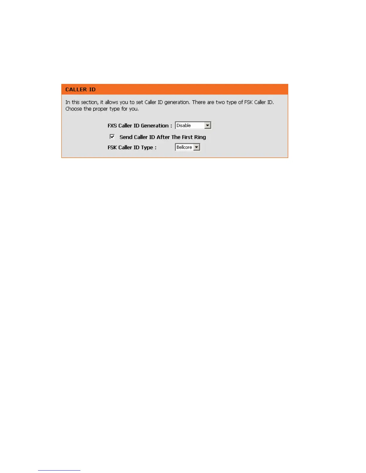 FXS Caller ID Generation: Select DTMF, FSK or FSK+Type II Caller ID to enable the caller ID display