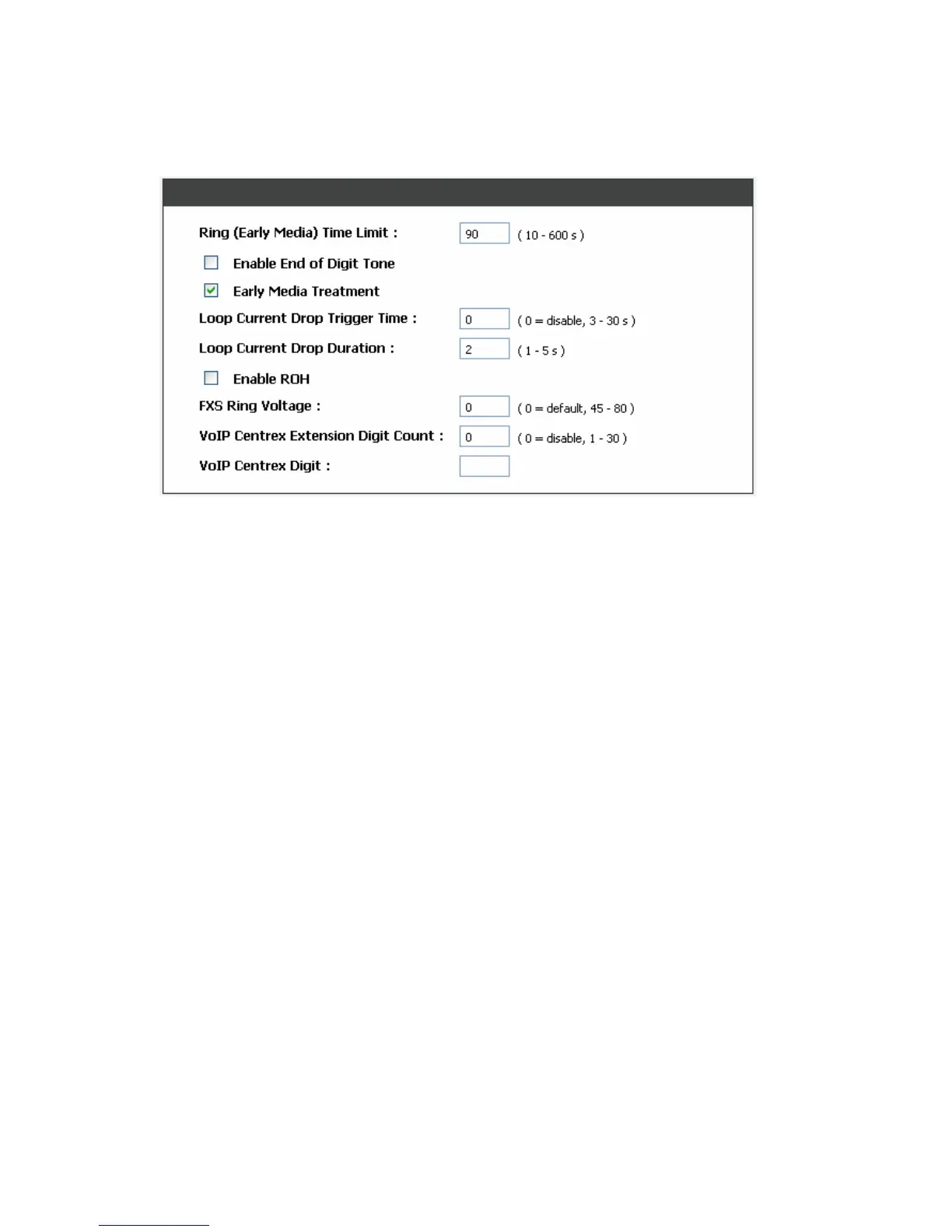 Ring (Early Media) Time Limit[10 - 600secs]: Enter the timeout to cancel a call if no one answers the