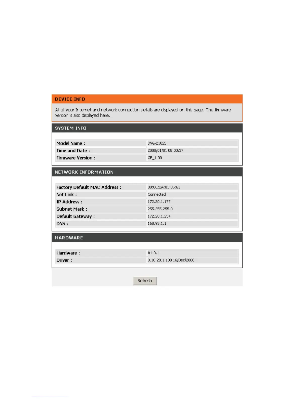 For Network Information, it shows factory default MAC address, IP address, subnet mask, default gateway