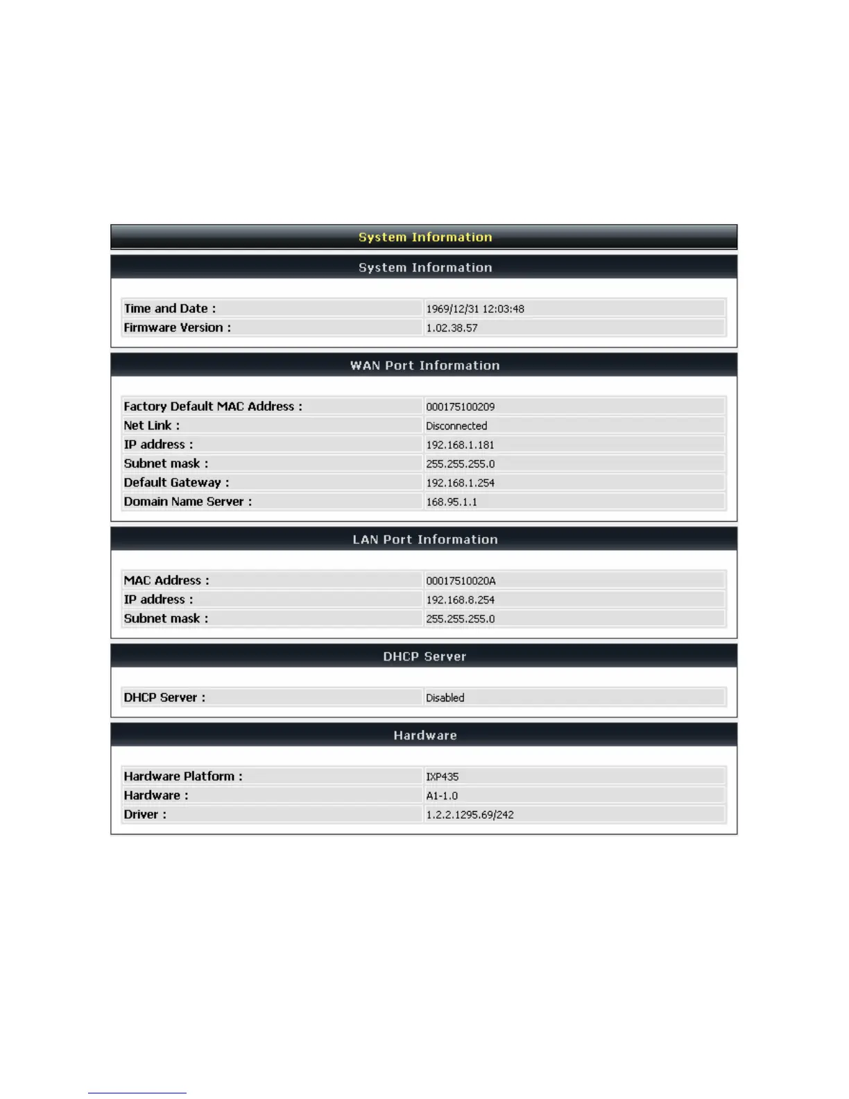 For LAN Port Information, it shows LAN port IP, subnet mask, and the status of DHCP server.