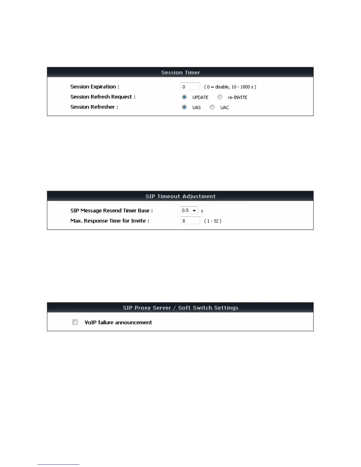 Session Expiration: This field will set the time that the VoIP Gateway will allow a SIP session to remain die