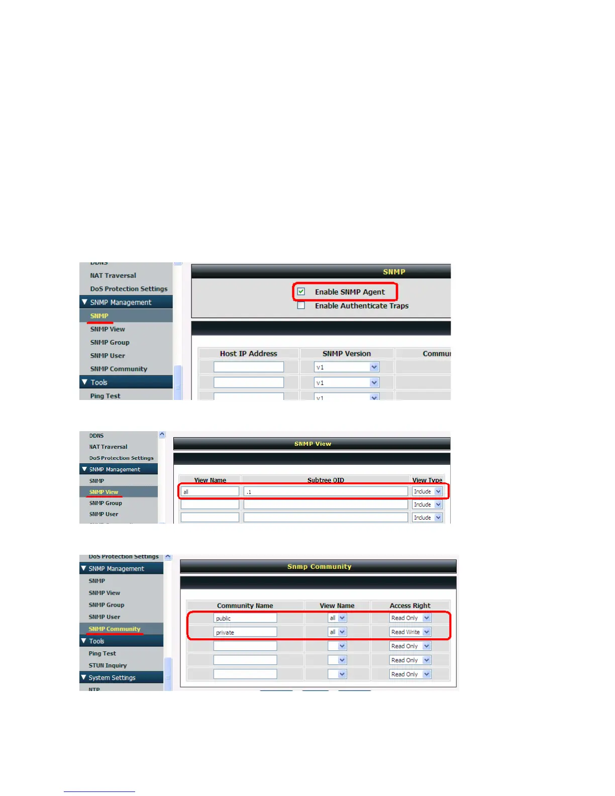 z Set [SNMP Management-> SNMP Community-> Community Name] for public and private.
