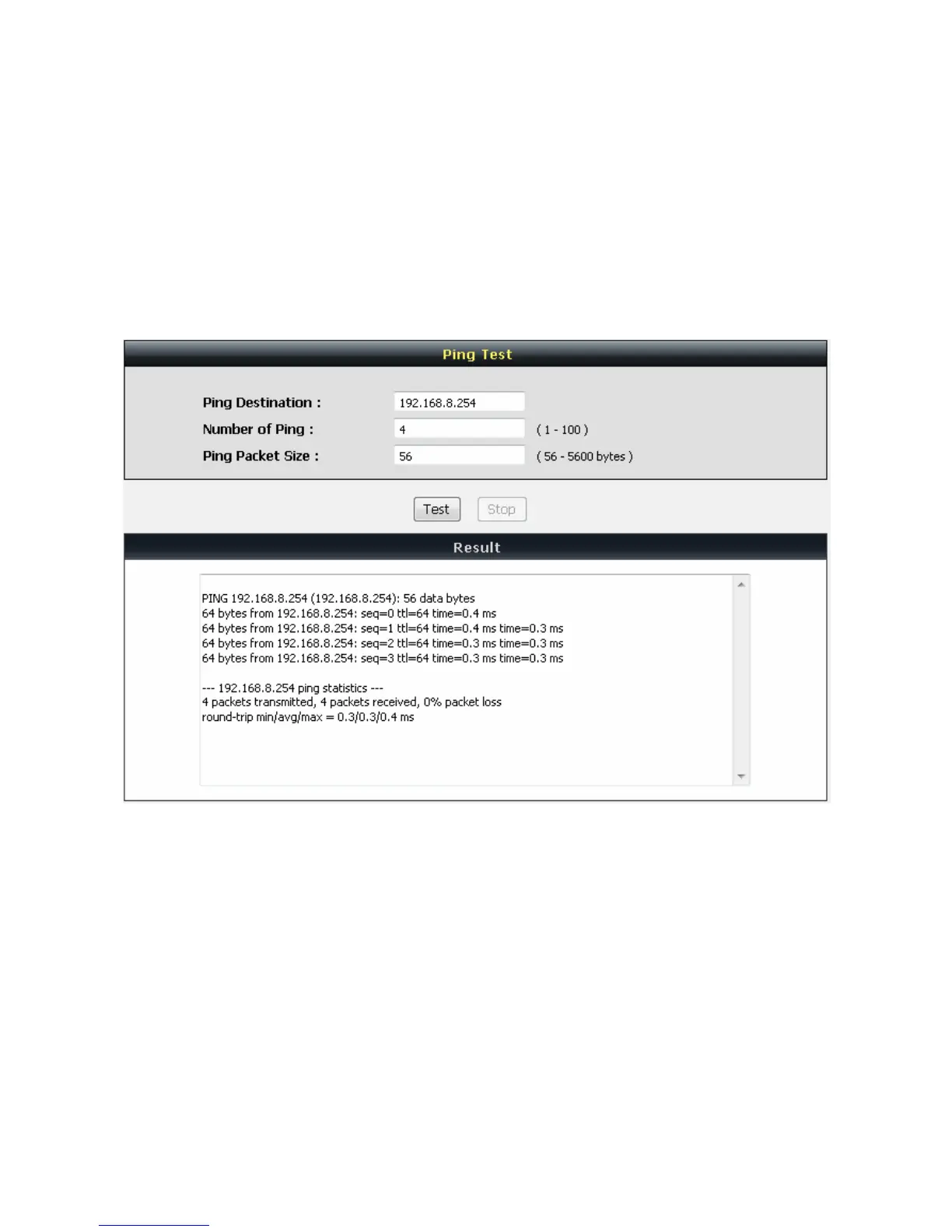 Use “Ping” to verify if a remote peer is reachable. Enter a remote IP address and click “Test” to ping the