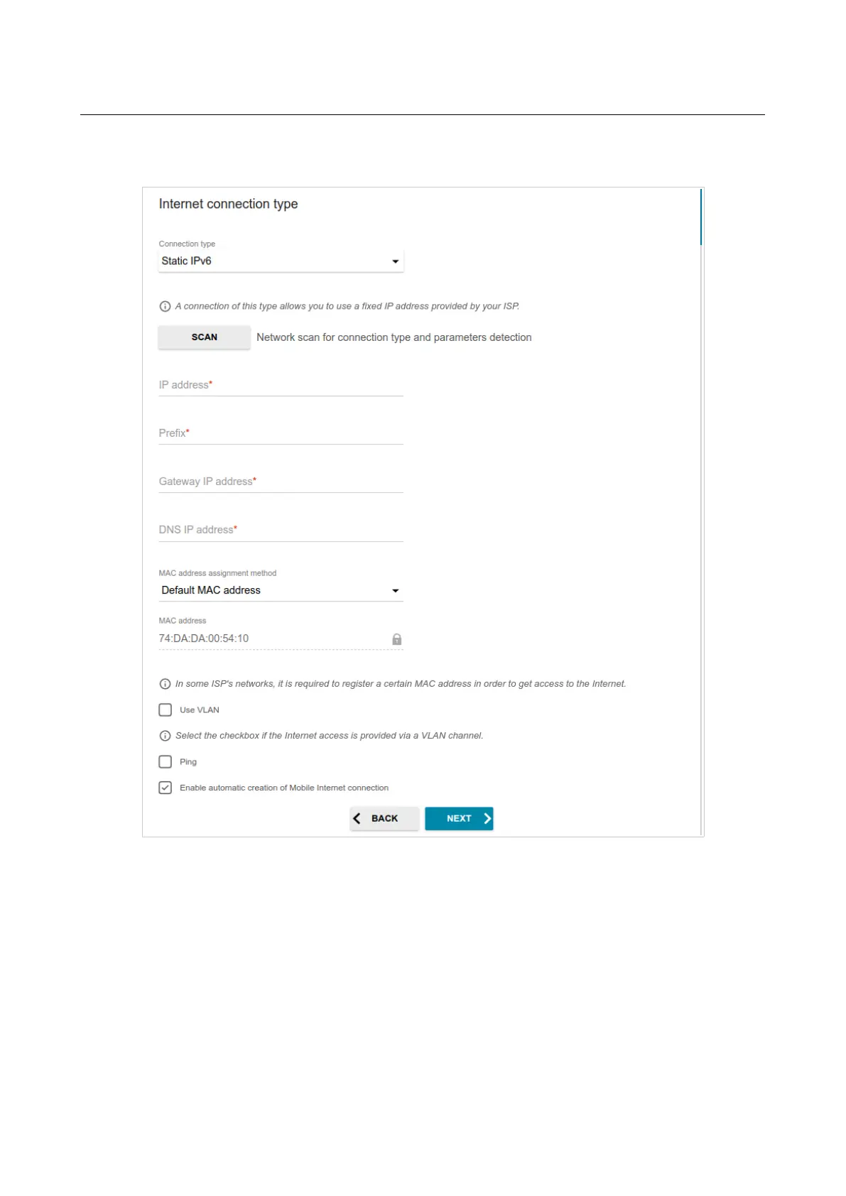 Figure 45. The page for configuring Static IPv6 WAN connection.