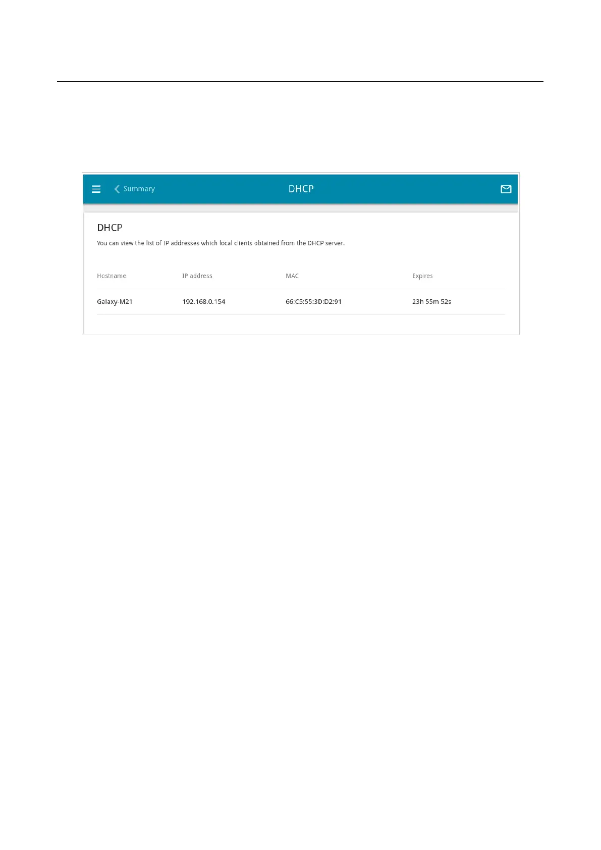 The  Statistics / DHCP  page displays the information on devices that have been identified by