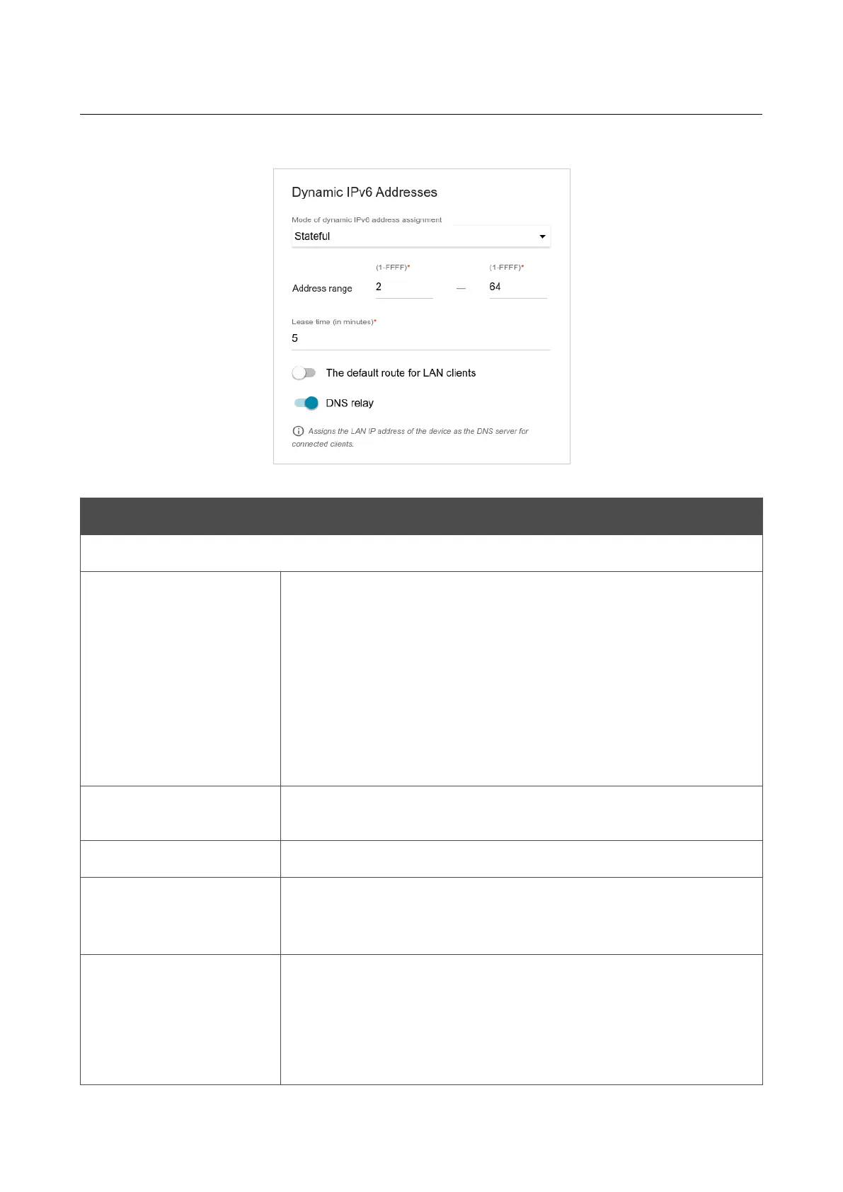 • Disable: Clients' IPv6 addresses are assigned manually.