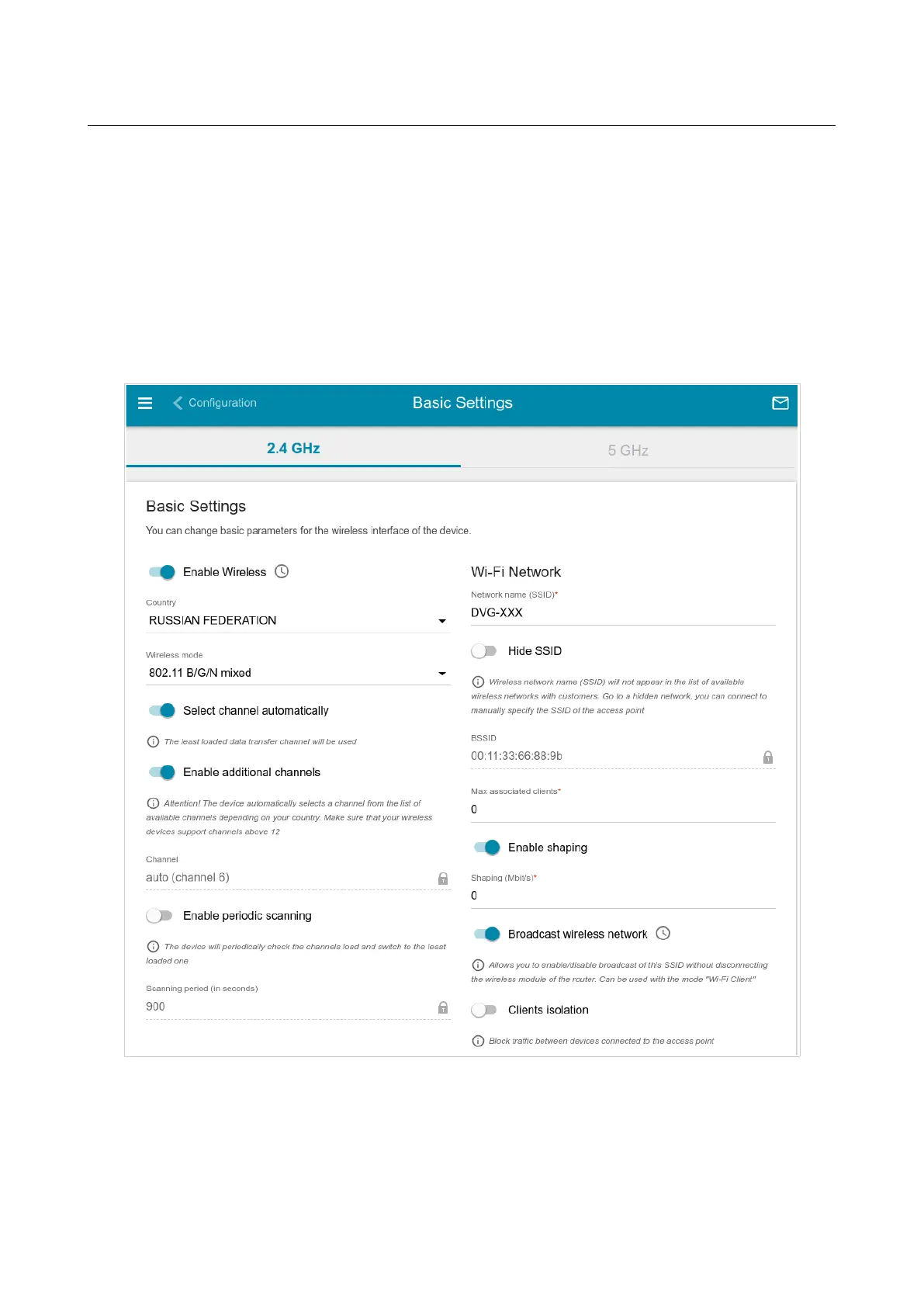 In the Wi-Fi / Basic Settings section, you can change basic parameters for the wireless interface