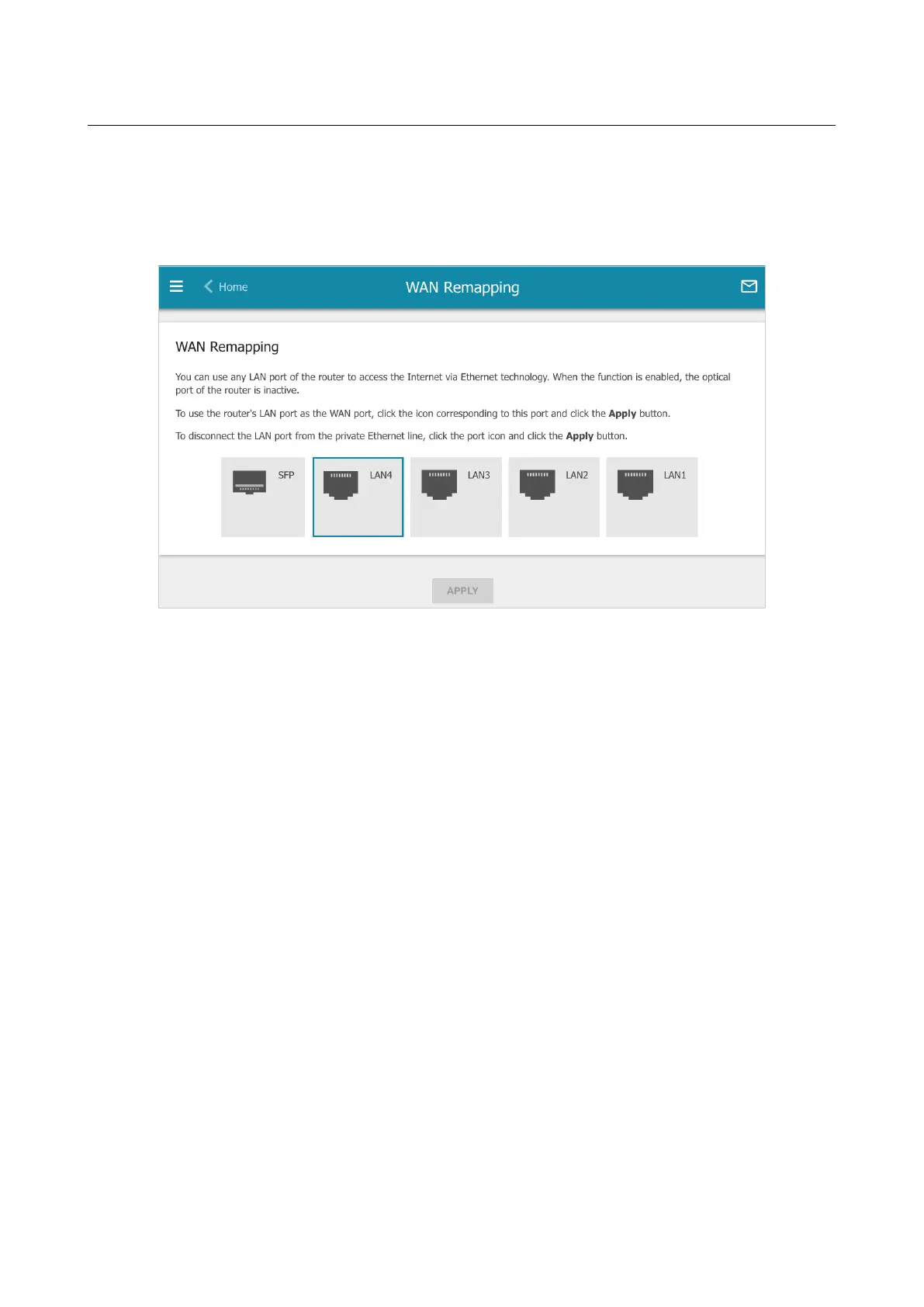 click the APPLY button. The port configured as the WAN port is highlighted in teal. When the