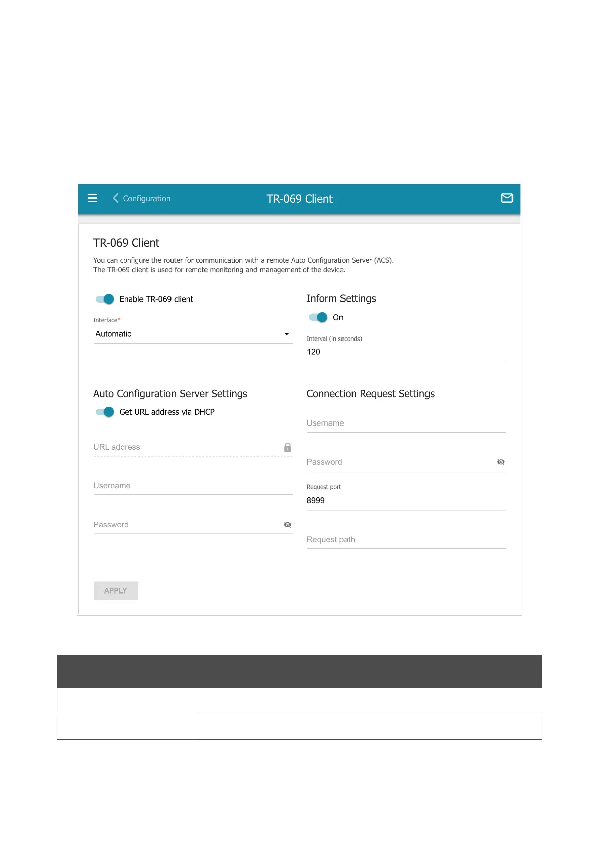 The TR-069 client is used for remote monitoring and management of the device.