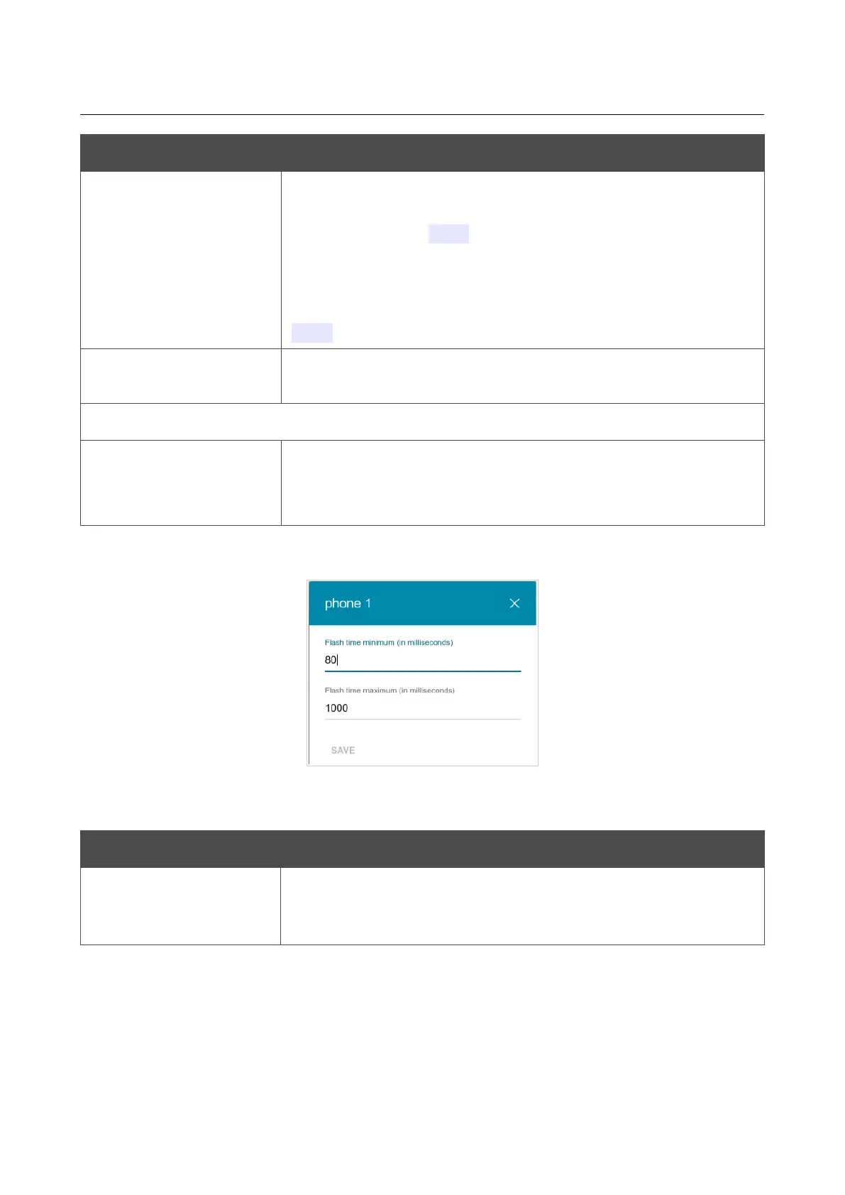 The maximum and minimum value for flash time (the user hangs up