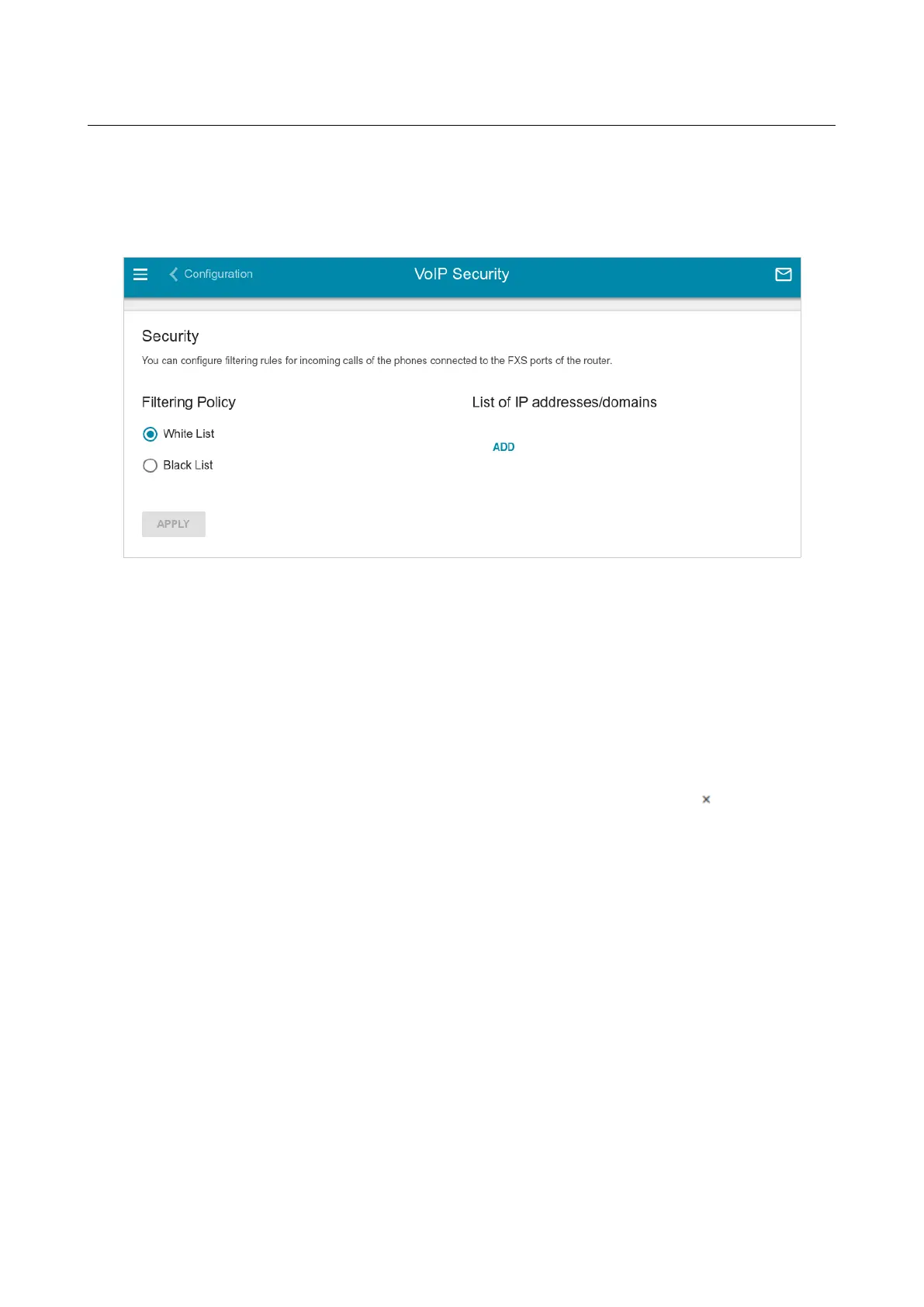 • White list: The router accepts incoming calls only from IP addresses or domains specified