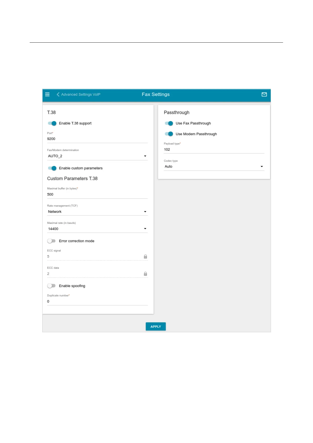On the VoIP / Profile Name / Fax Settings page, you can specify settings of data