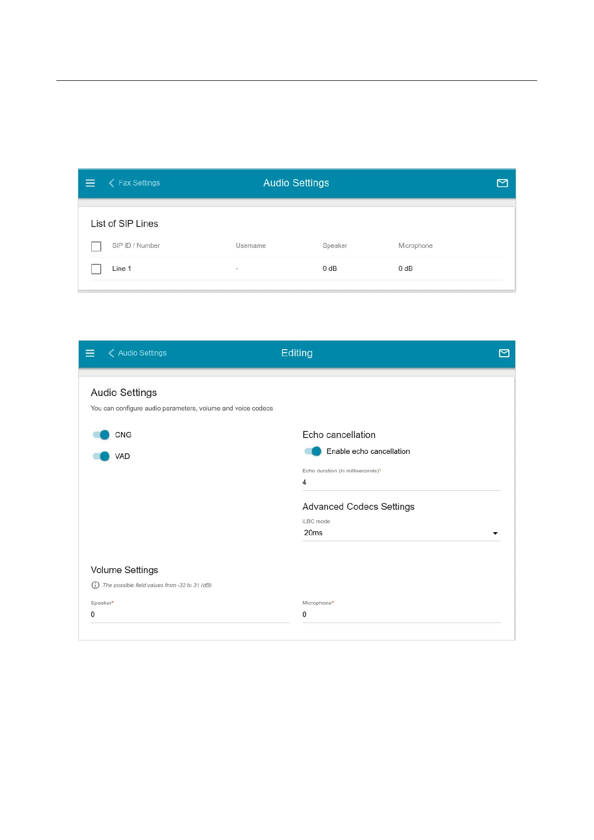 On the VoIP / Profile Name / Audio Settings page, you can configure audio parameters,
