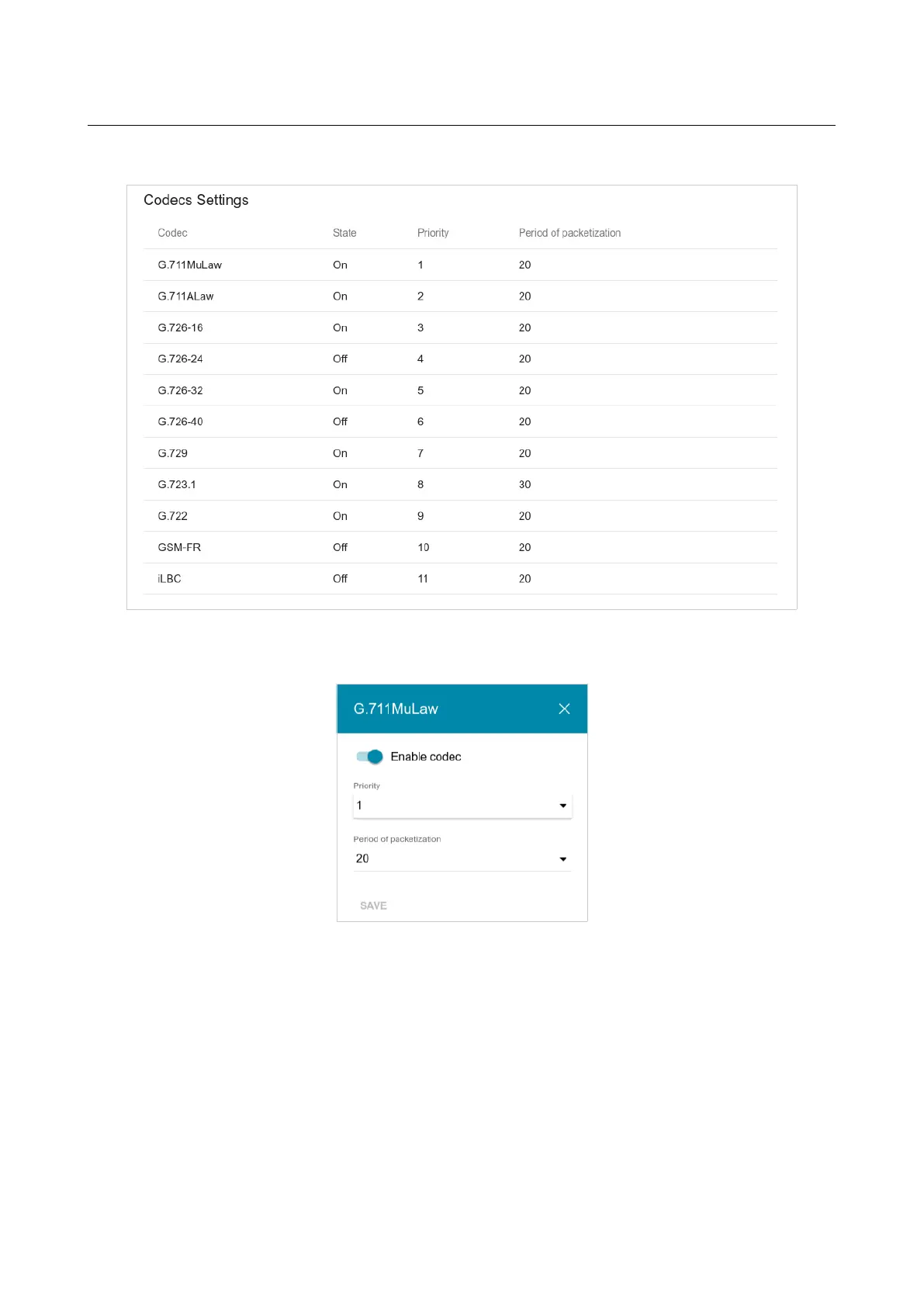 In the Codecs Settings section, you can configure work of voice codecs in use.