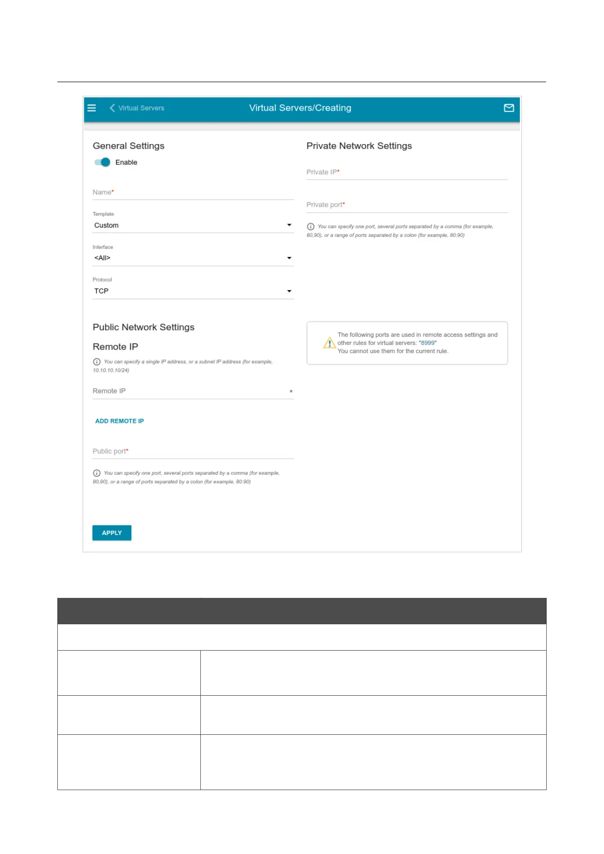 Custom to specify all parameters of the new virtual server