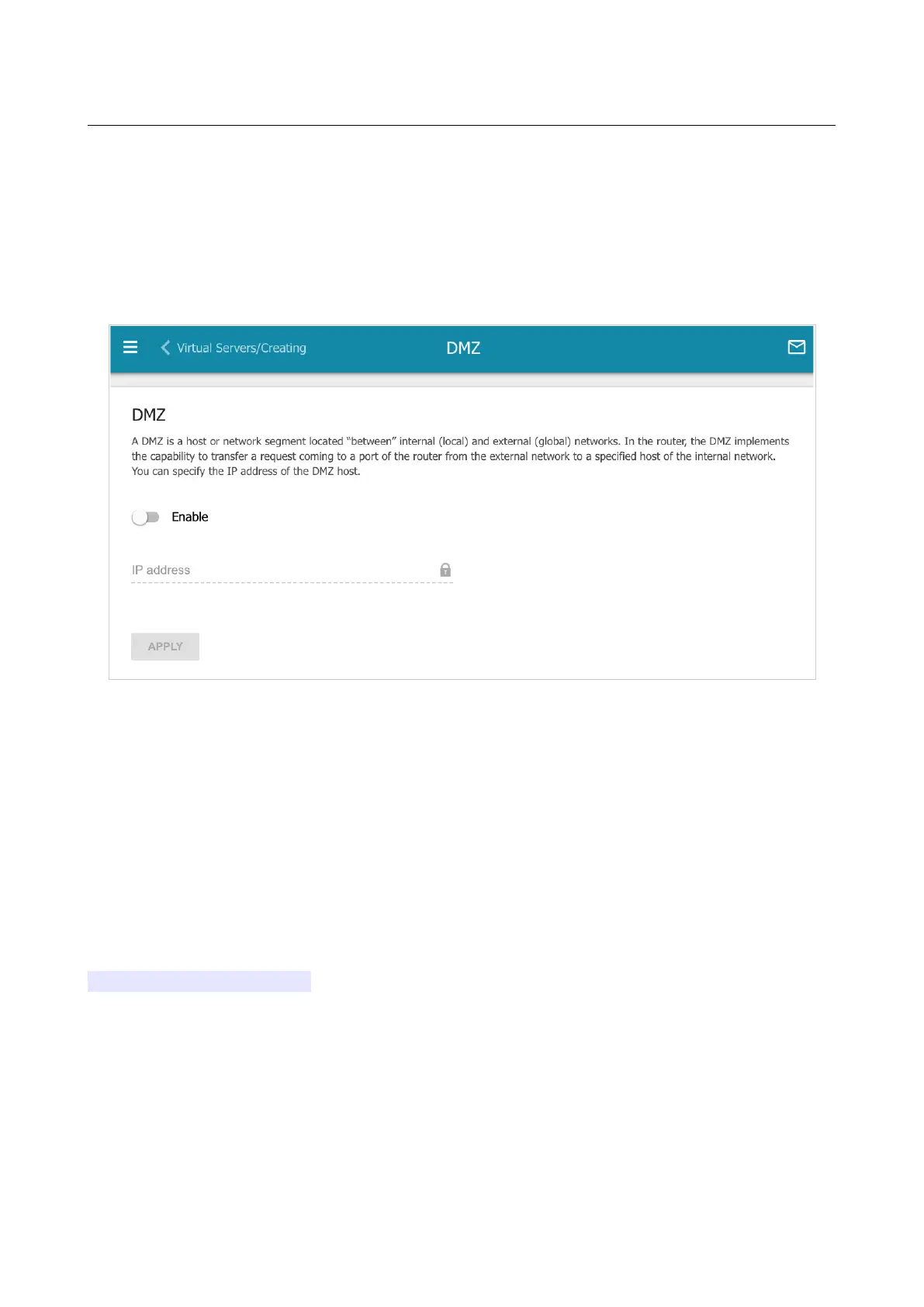 To disable the DMZ, move the Enable switch to the left and click the APPLY button.
