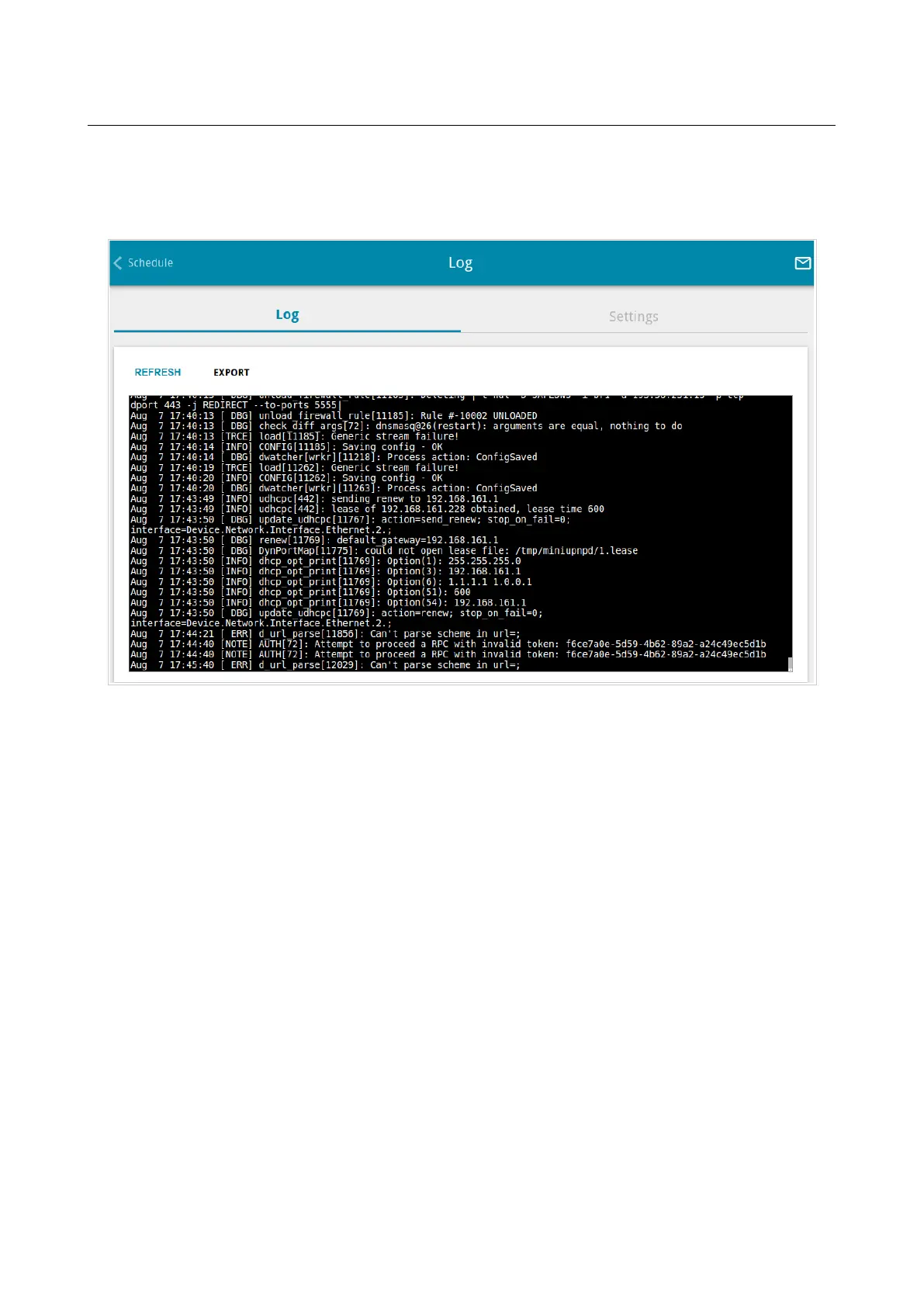 To save the system log to your PC, click the EXPORT button. The file will be stored in the