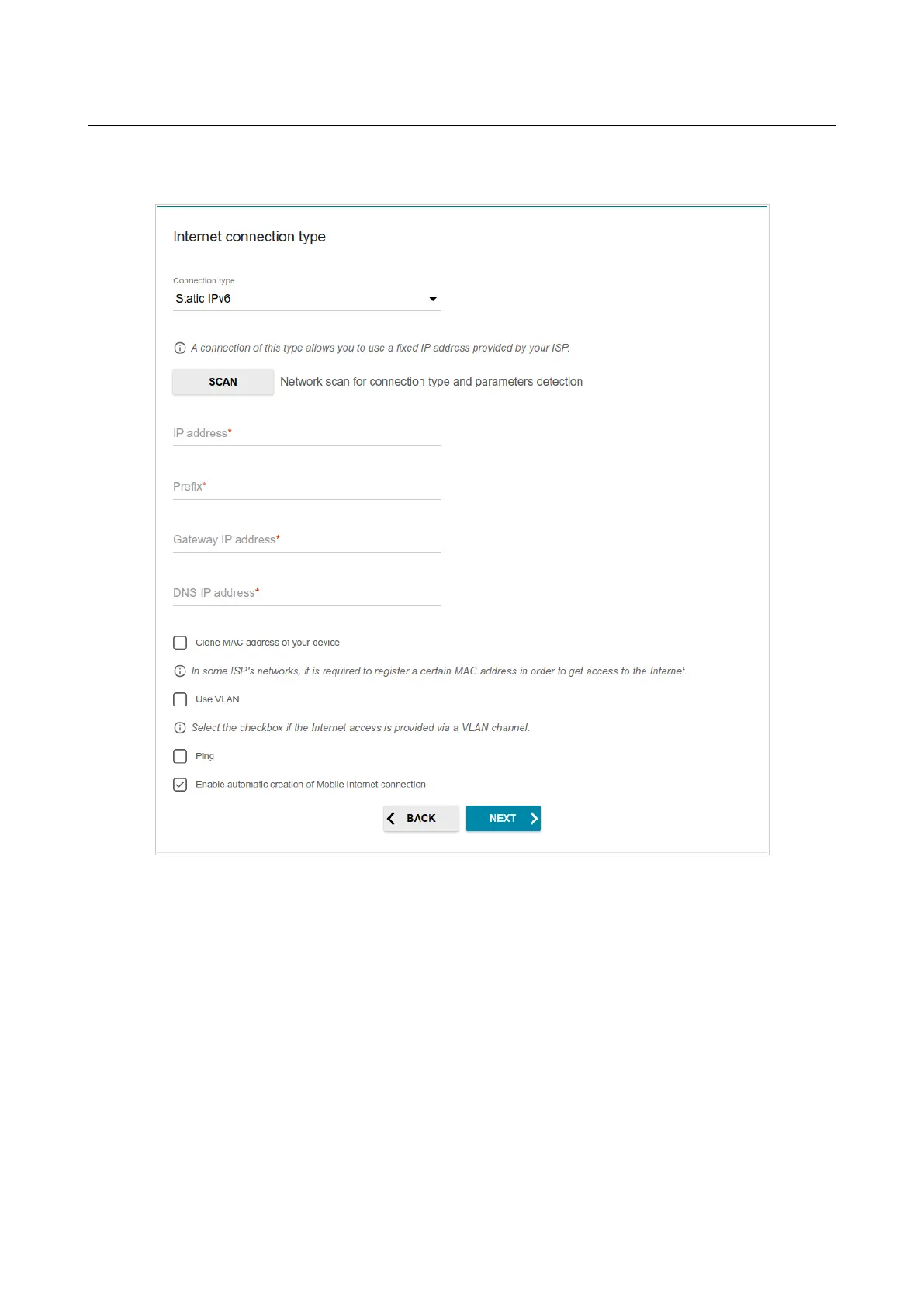 Figure 47. The page for configuring Static IPv6 WAN connection.