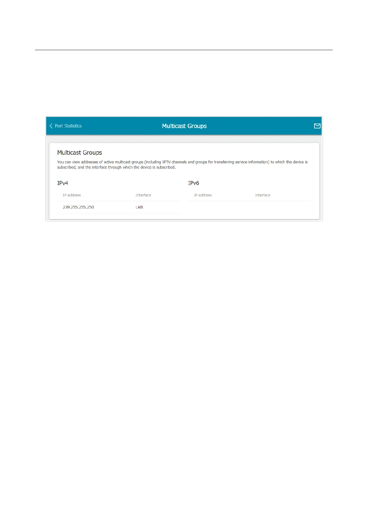 The Statistics / Multicast Groups page displays addresses of active multicast groups (including