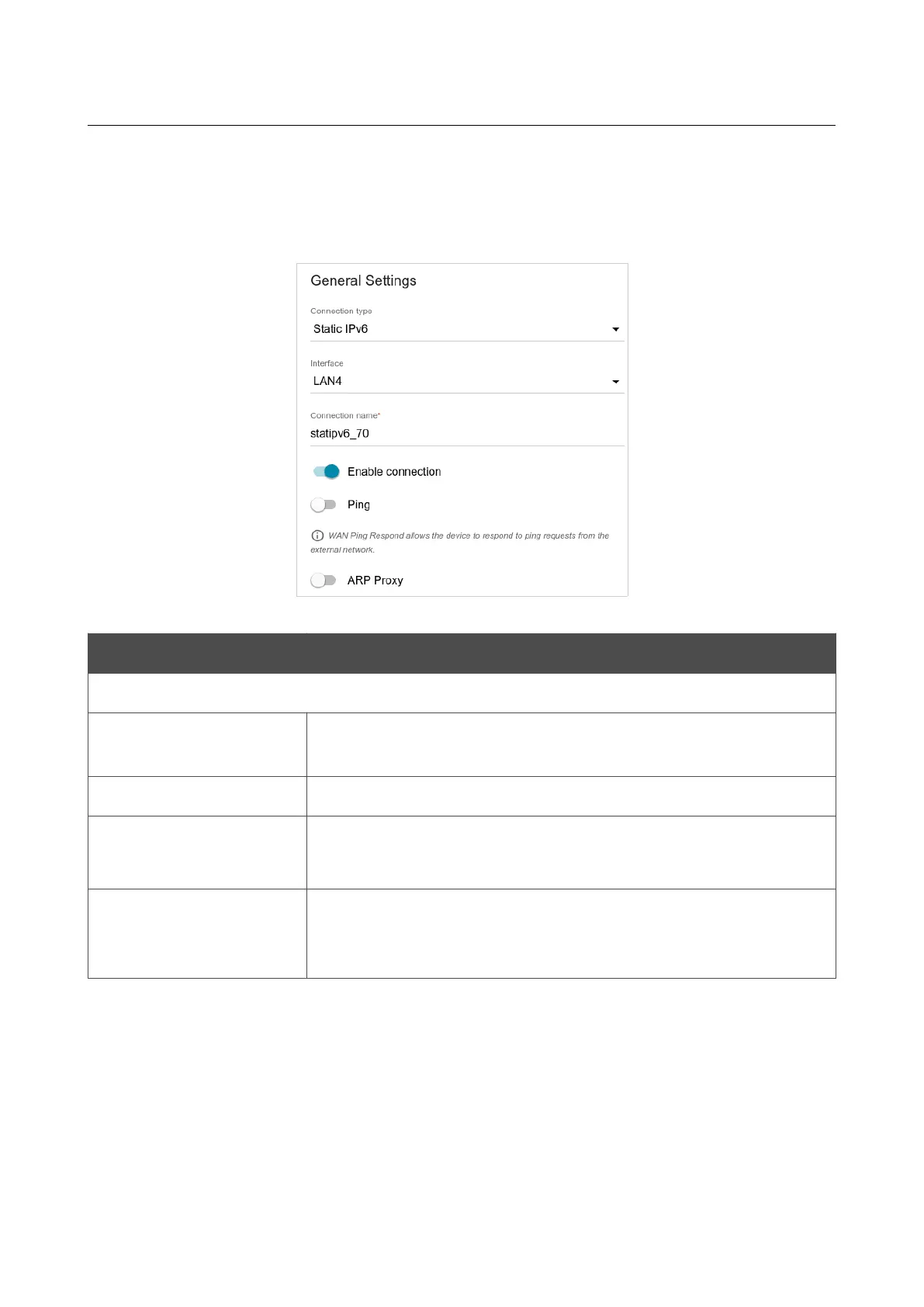 Figure 70. The page for creating a new Static IPv6 connection. The General Settings section.