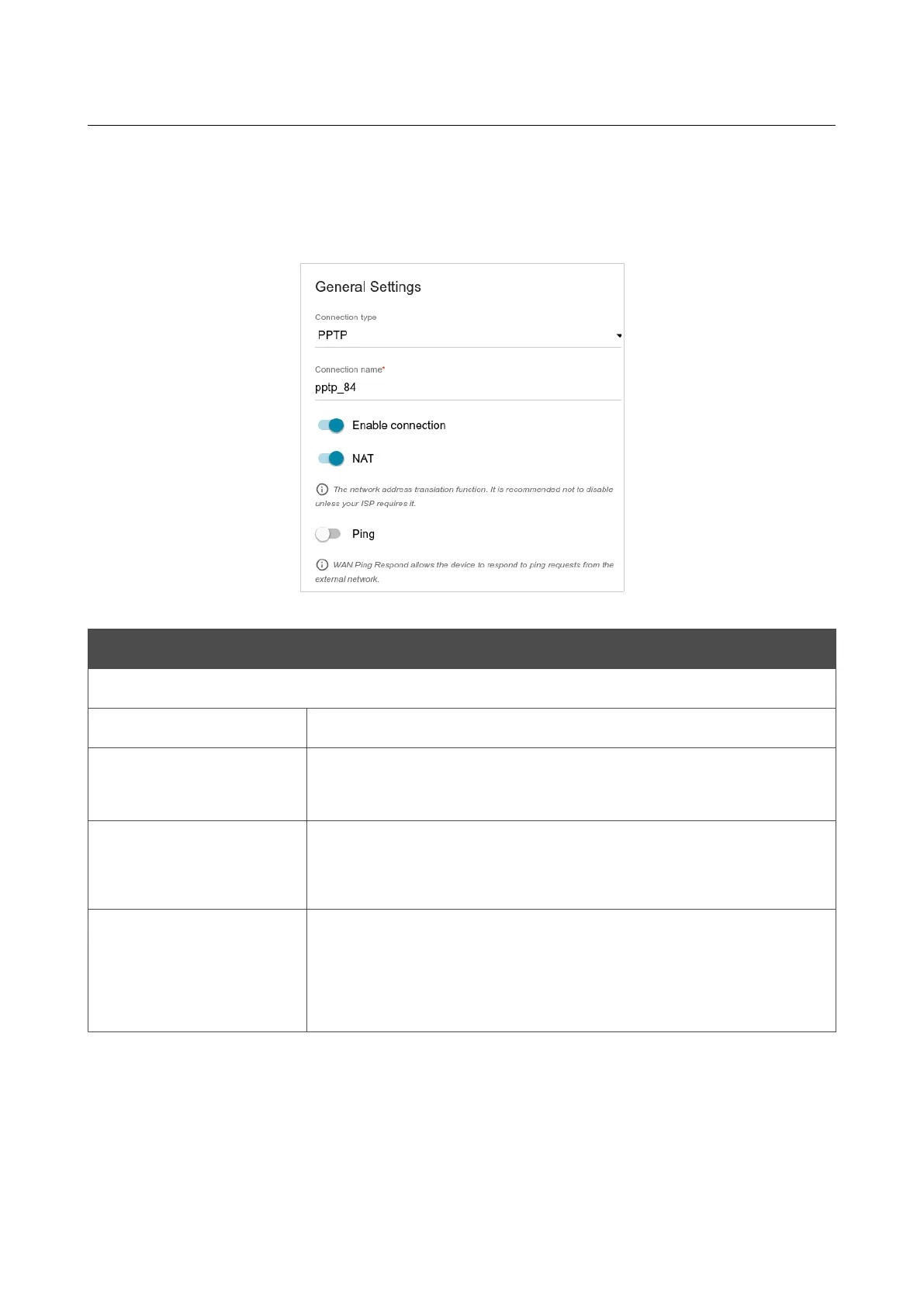 Figure 77. The page for creating a new PPTP connection. The General Settings section.
