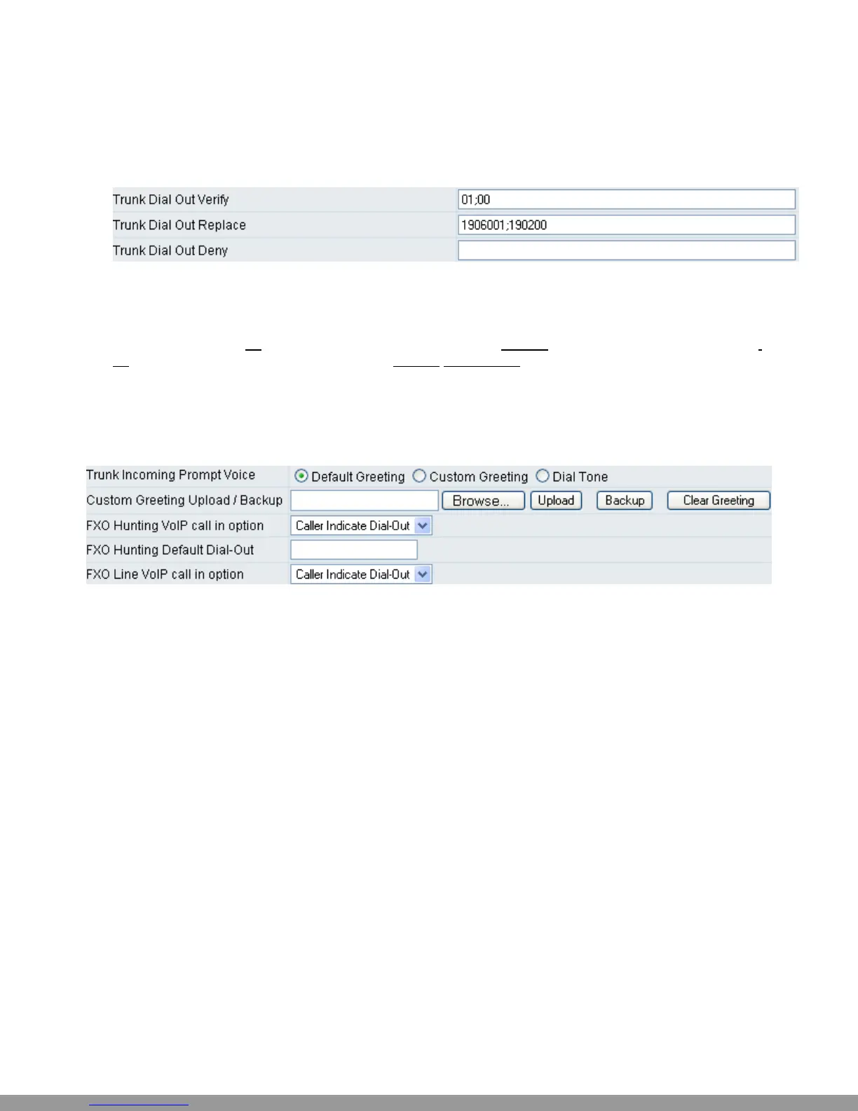 y Trunk Dial Out Verify/ Trunk Dial Out Replace: VoIP gateway will check (verify) the dial out
