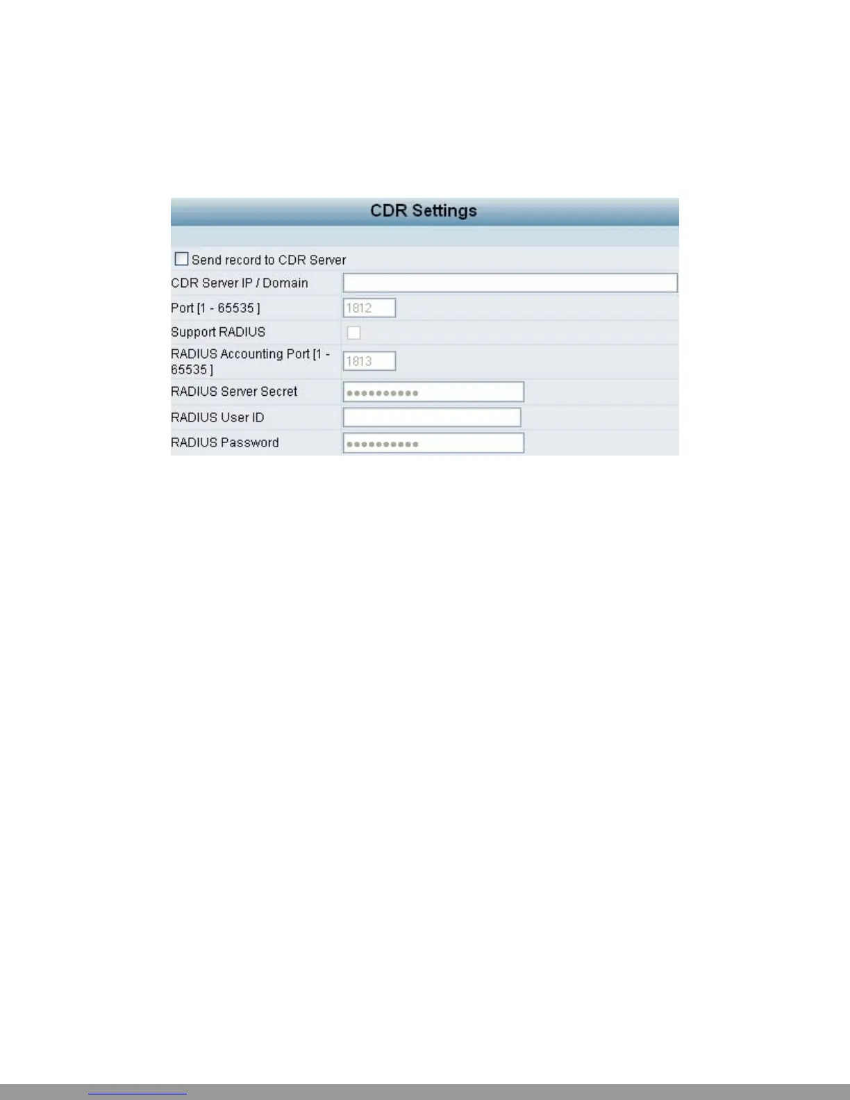 The user can set up a CDR Server to record call details for every phone call. CDR provides call detail